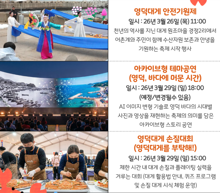 제29회 영덕대게축제는 영덕의 대표 특산물인 영덕대게를 주제로 한 체험 중심의 봄 축제입니다.
