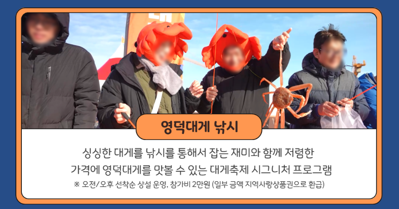 대게 낚시, 통발잡이, 대게탈축구, 줄다리기, 손질대회 등 다양한 프로그램이 준비되어 있습니다.