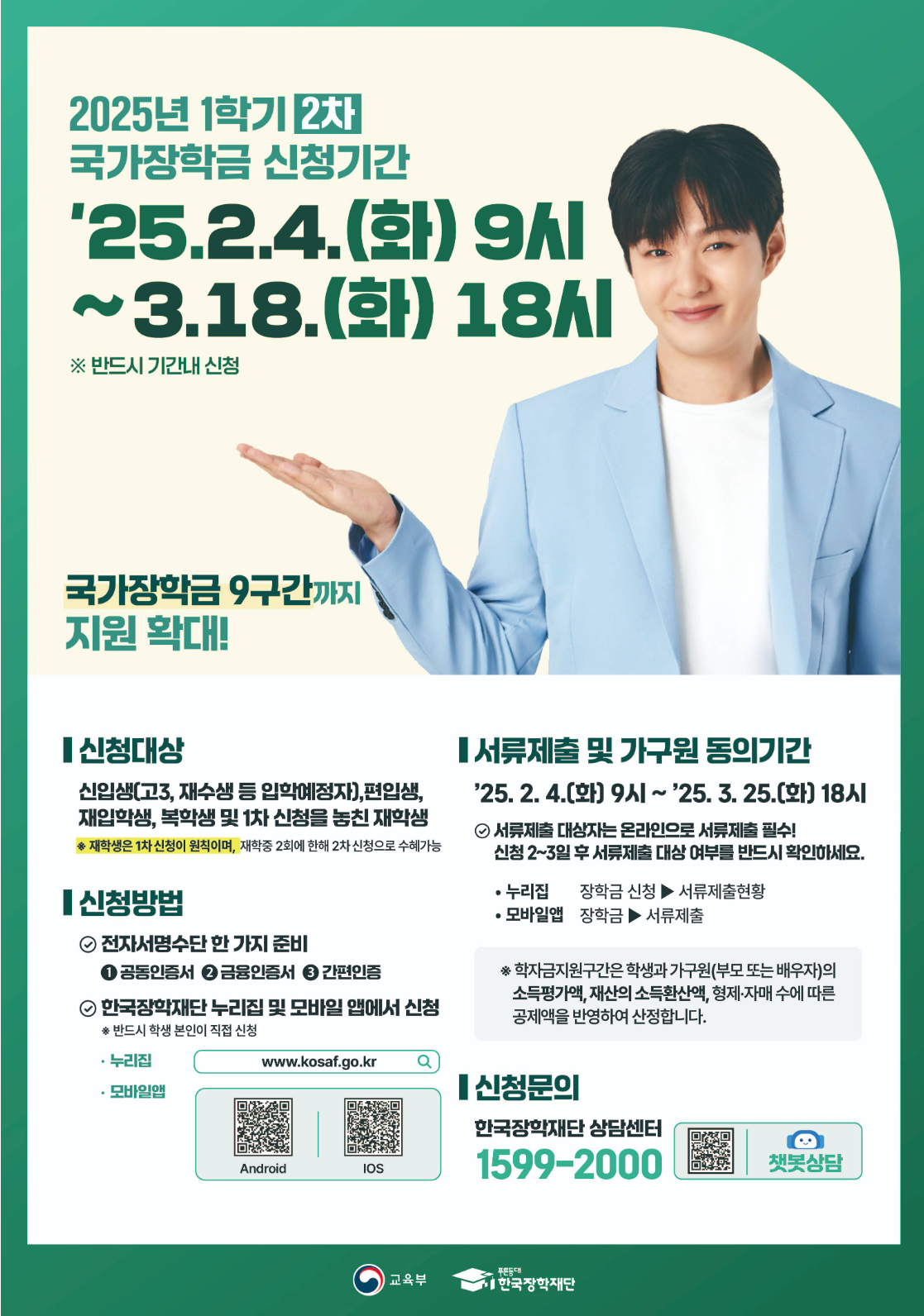 2025년 국가장학금 2차 신청기간은 2025년 2월 4일(화) 9시부터 3월 18일(화) 18시까지입니다. 이 기간 동안 온라인으로 신청할 수 있으며, 서류 제출 및 가구원 동의 마감은 2025년 2월 4일(화) 9시부터 3월 25일(화) 18시까지입니다. 신청 방법은 한국장학재단 누리집(www.kosaf.go.kr)과 ‘한국장학재단’ 모바일 앱을 통해 24시간 신청 진행됩니다. 신청 시 필요한 서류는 다음과 같습니다.