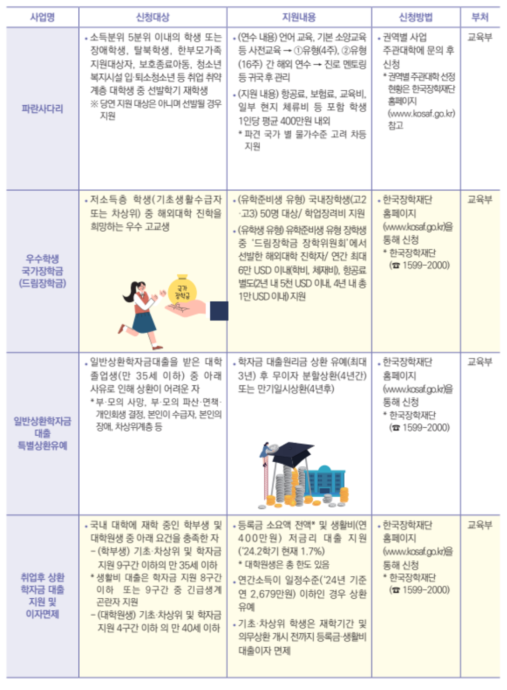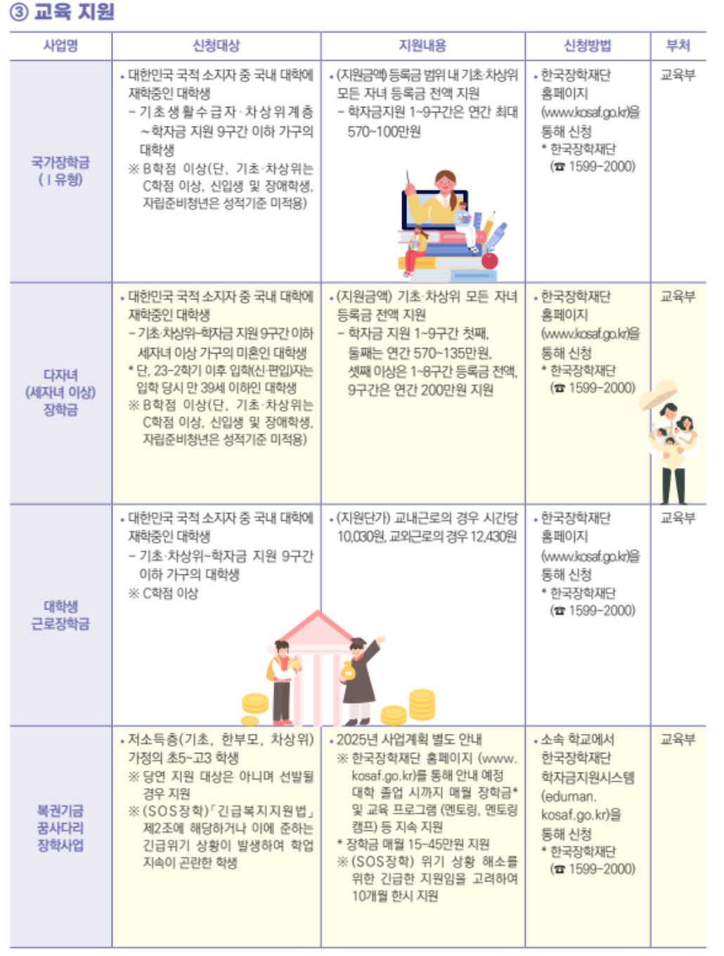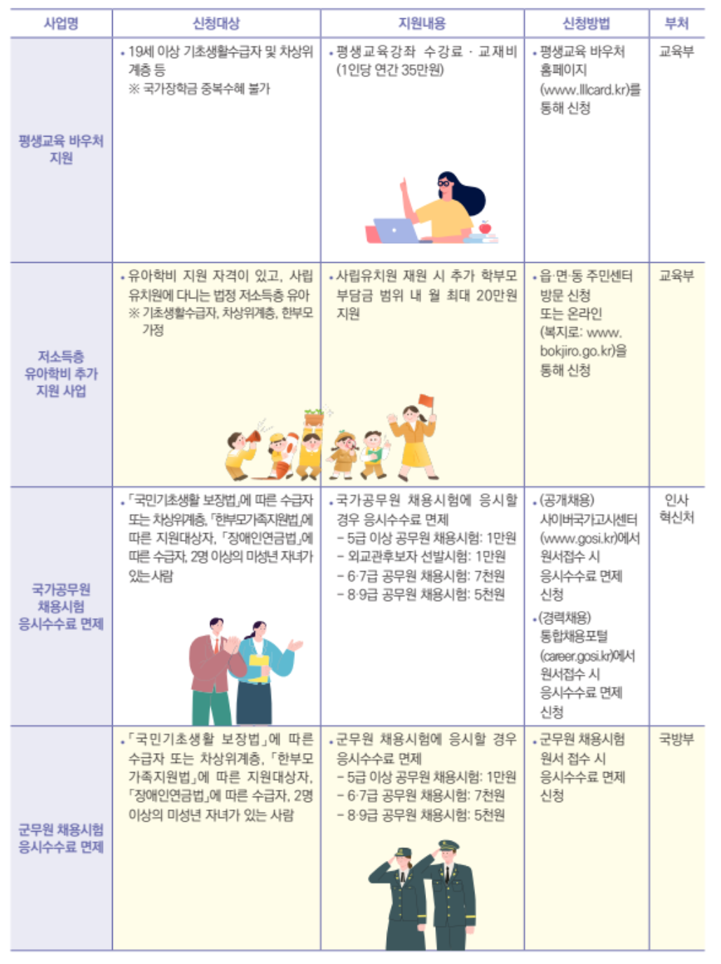 차상위계층 아동 및 청소년을 위한 교육지원 정책도 마련되어 있습니다. 정부는 차상위계층 가구의 자녀에게 학비 지원과 함께 다양한 교육 프로그램을 제공할 계획입니다. 이를 통해 교육의 기회를 평등하게 제공하고, 차상위계층 가구의 자녀들이 더 나은 미래를 꿈꿀 수 있도록 돕고자 합니다.