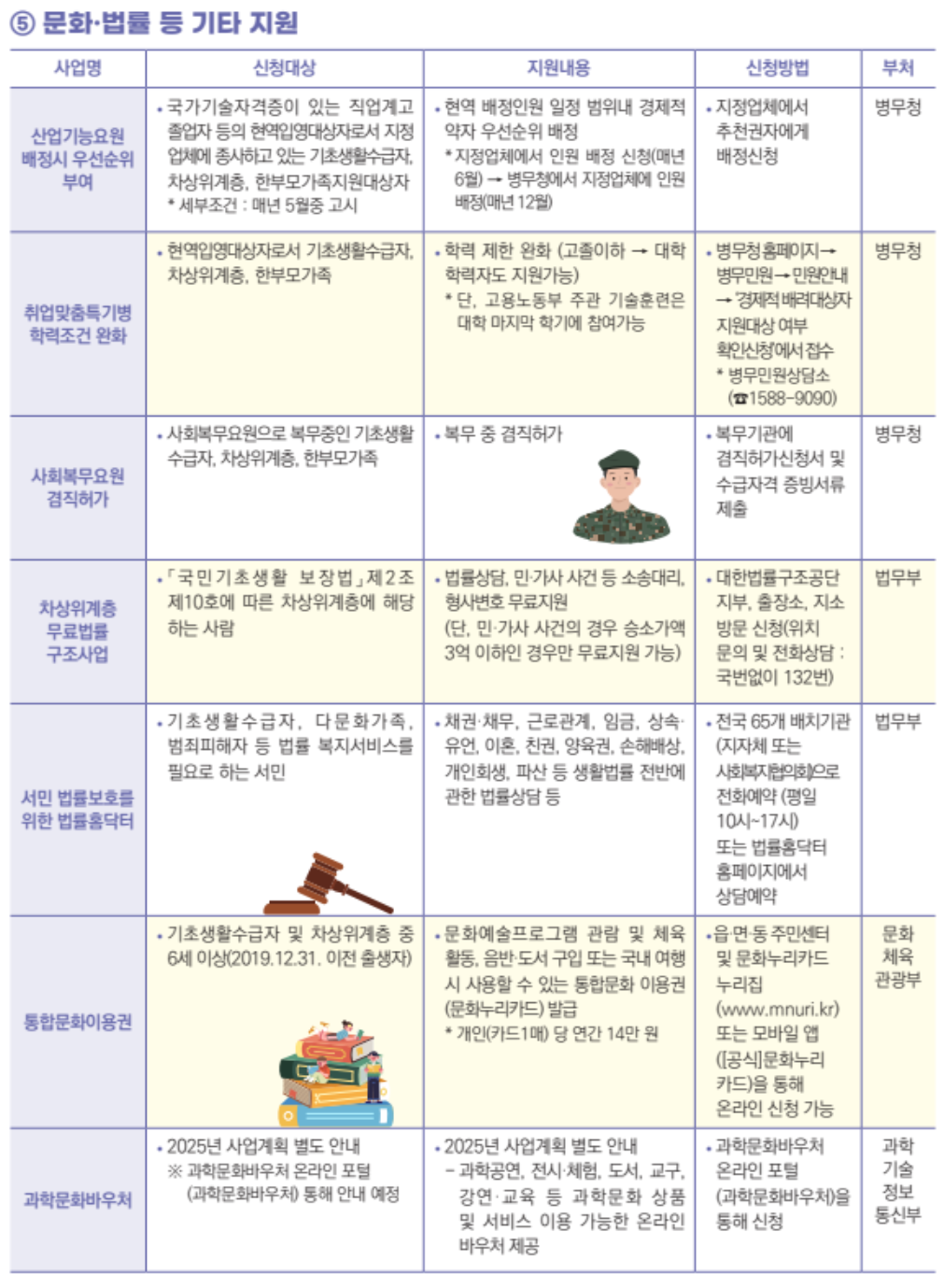 2025년에는 차상위계층을 위한 문화누리 카드가 도입됩니다. 이 카드는 문화 및 여가 활동을 지원하는 카드로, 다양한 문화 행사와 관광지 이용 시 할인 혜택을 제공합니다. 또한, 법률 지원 프로그램도 마련되어 있어, 법적 문제로 어려움을 겪는 차상위계층에게 필요한 법률 상담과 지원을 제공할 것입니다.