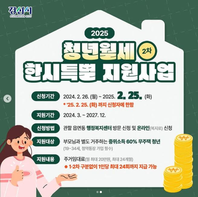 2025년 청년월세 한시 특별지원 사업에 대해 알아보겠습니다. 이 사업은 청년들이 안정적인 주거 환경을 조성할 수 있도록 돕기 위해 마련된 지원 프로그램입니다. 많은 청년들이 이 지원을 통해 경제적 부담을 덜 수 있기를 바랍니다. 그럼 자세히 살펴보겠습니다!