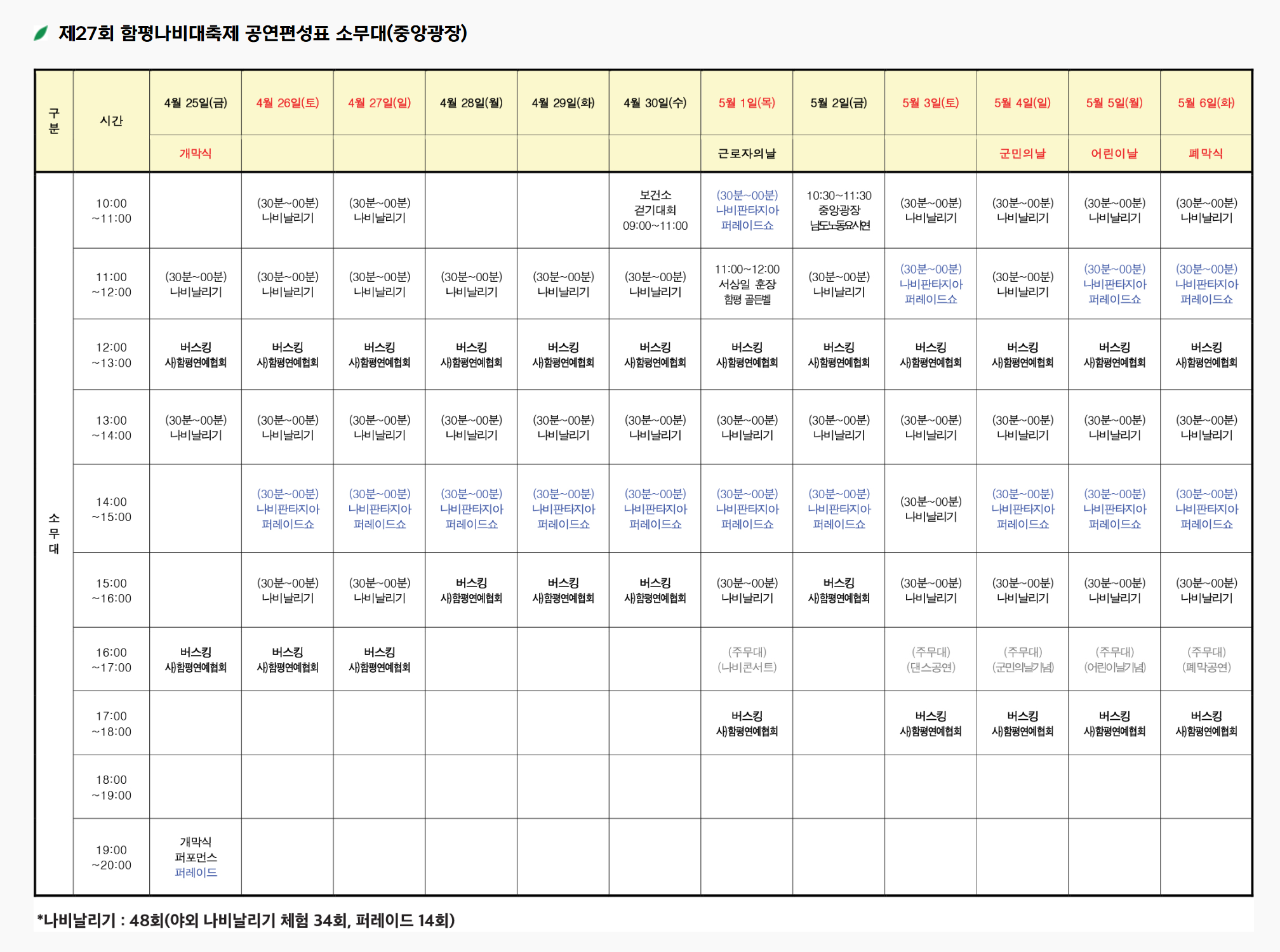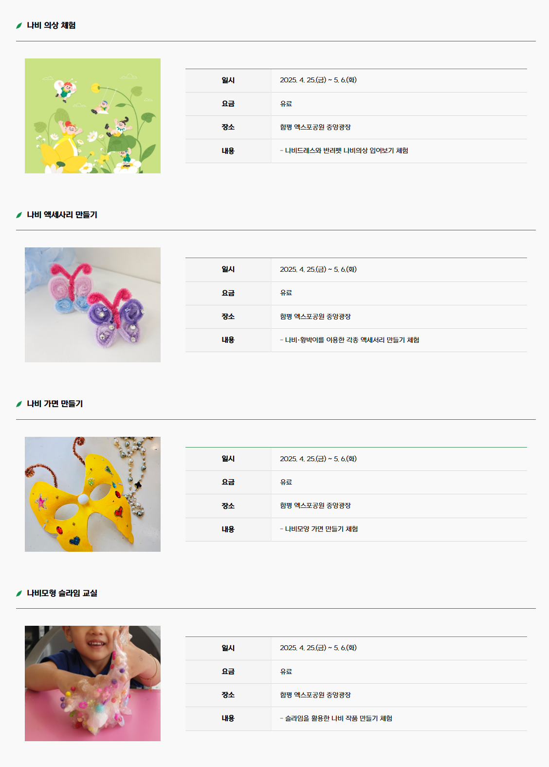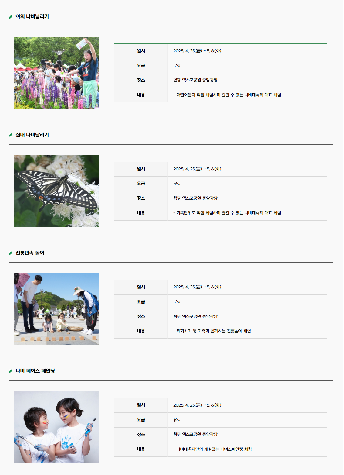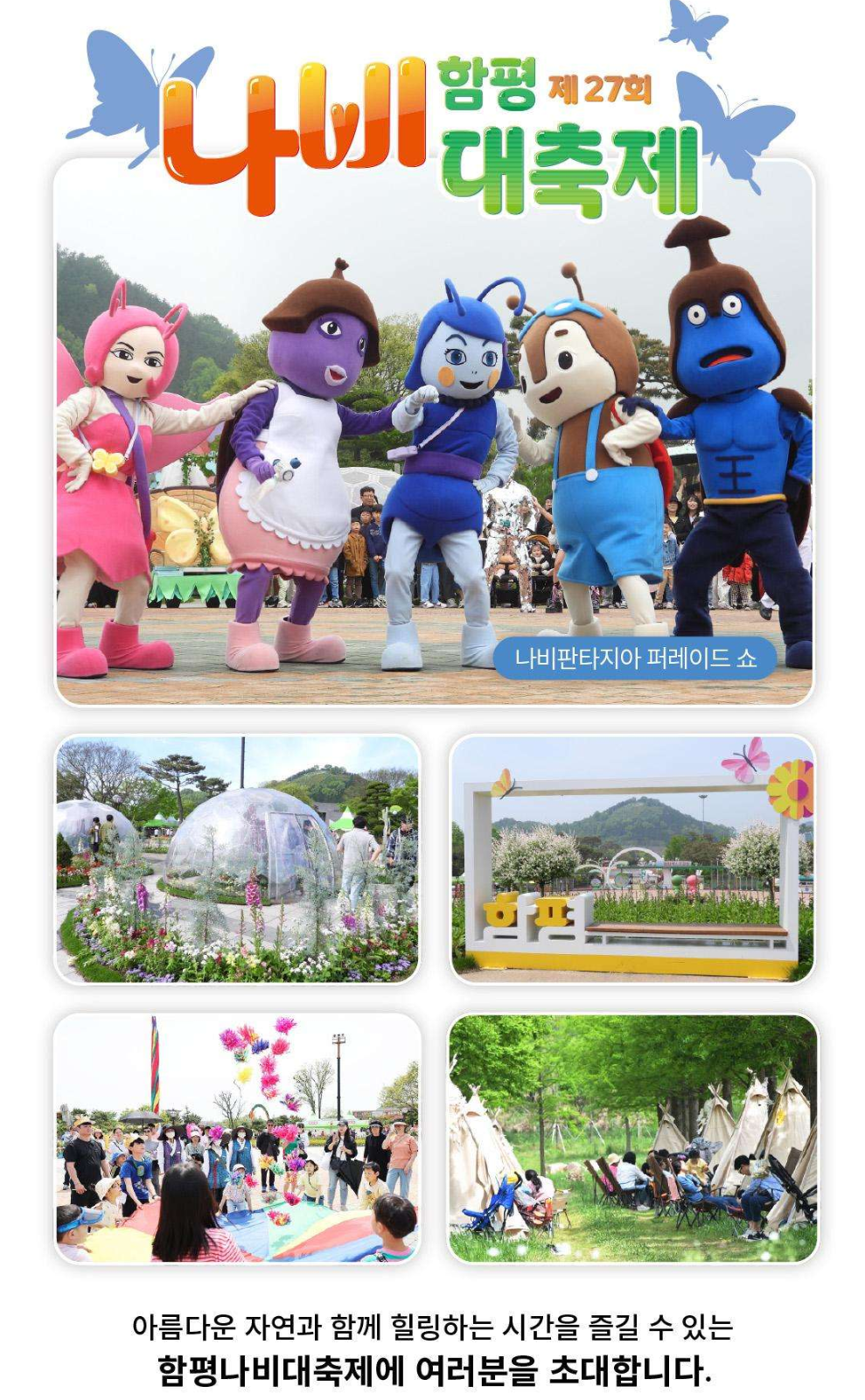 축제 기간 동안은 다양한 먹거리와 볼거리가 가득하니, 가족과 함께 즐거운 시간을 만드시길 바랍니다. 풍성한 나비와 꽃들이 여러분을 기다리고 있습니다.