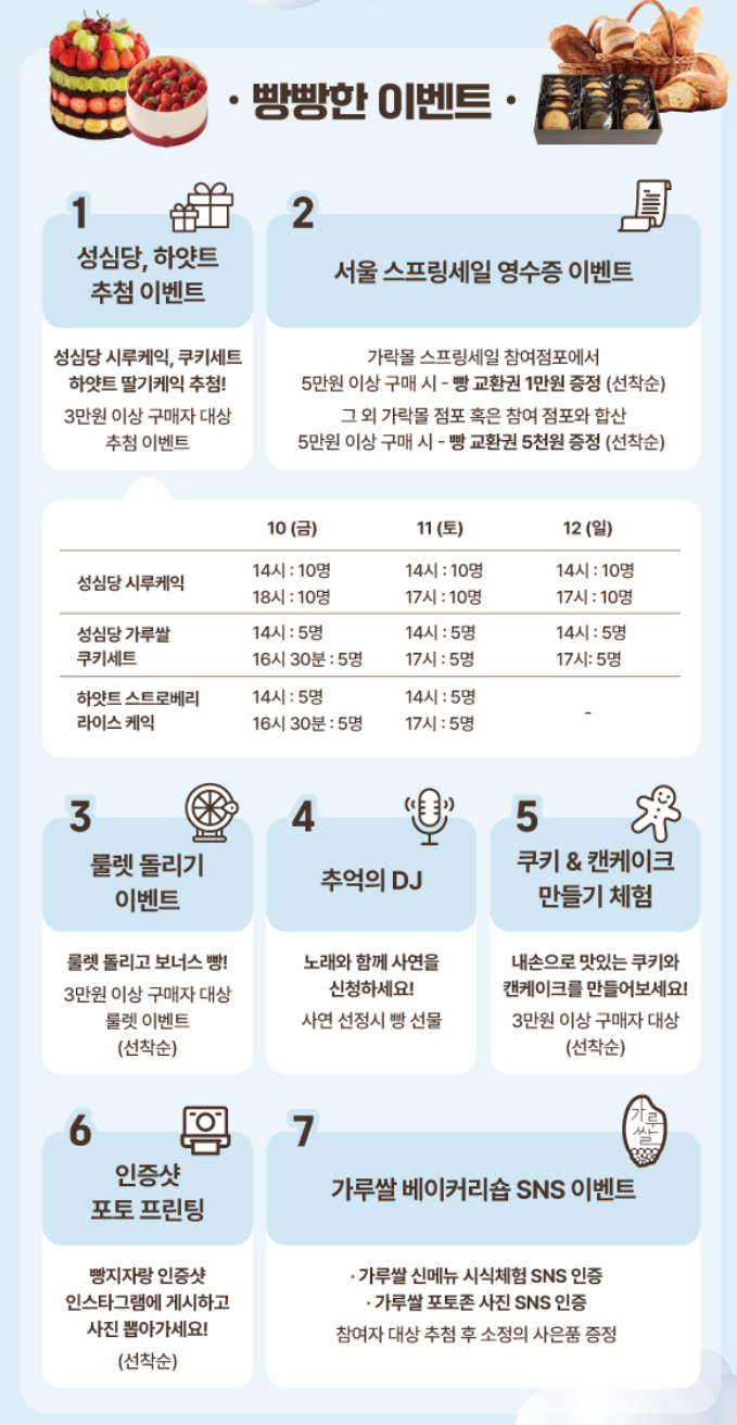 - 서울 스프링세일 영수증 이벤트 : 가락몰 스프링세일 참여점포에서 5만원 이상 구매 시 빵 교환권 1만원 증정, 가락몰 OR참여점포 합산 5만원 이상 구매 시 빵 교환권 5천원 증정