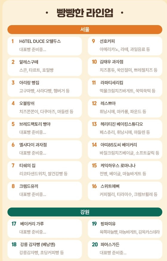 축제에 참여하는 빵집들은 서울과 강원 지역의 유명한 곳들로 구성되어 있습니다. 예를 들어, 서울의 HÔTEL DUCE , Alpeisgu 와 같은 유명한 빵집들이 참여하여 그들의 특별한 빵을 선보일 예정입니다.