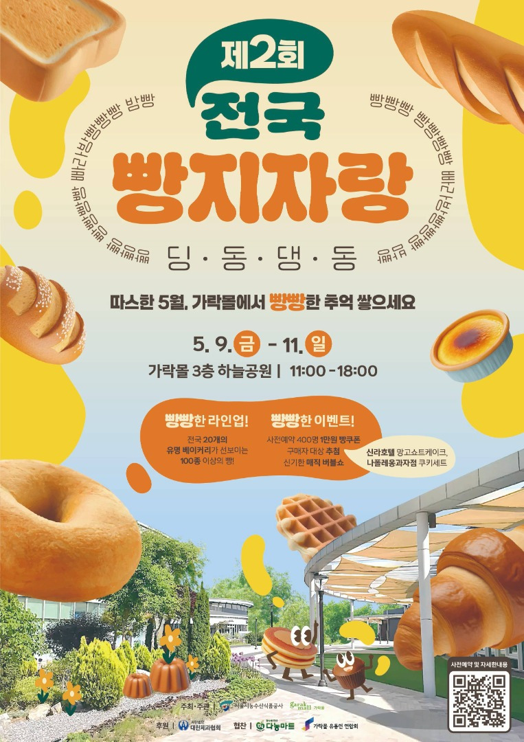 - 가락몰 및 빵지자랑 구매자 대상 빵쿠폰 100% 증정 : 3만원 이상 구매 영수증 지참 후 행사부스 방문 →5천원 빵쿠폰 증정, 선착순 1500명