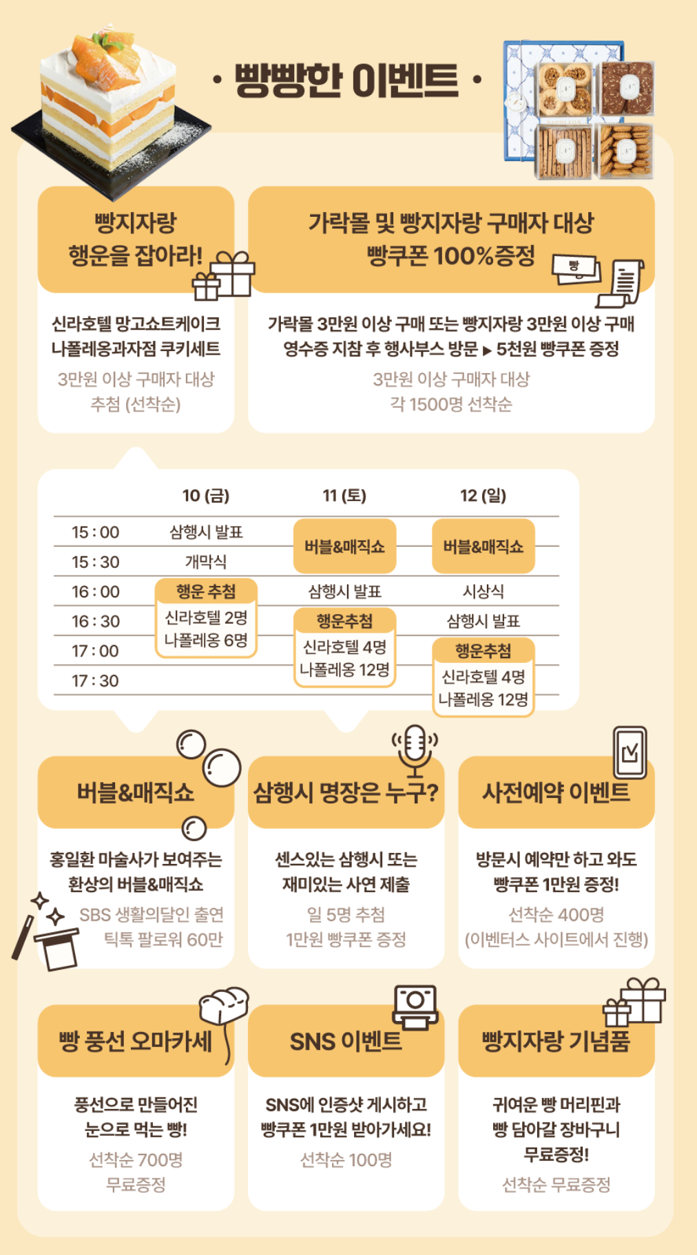 - 빵지자랑 행운을 잡아라! : 3만원 이상 구매자 대상 추첨(선착순) / 상품 : 신라호텔망고쇼트케이크, 나폴레옹과자점 쿠키세트