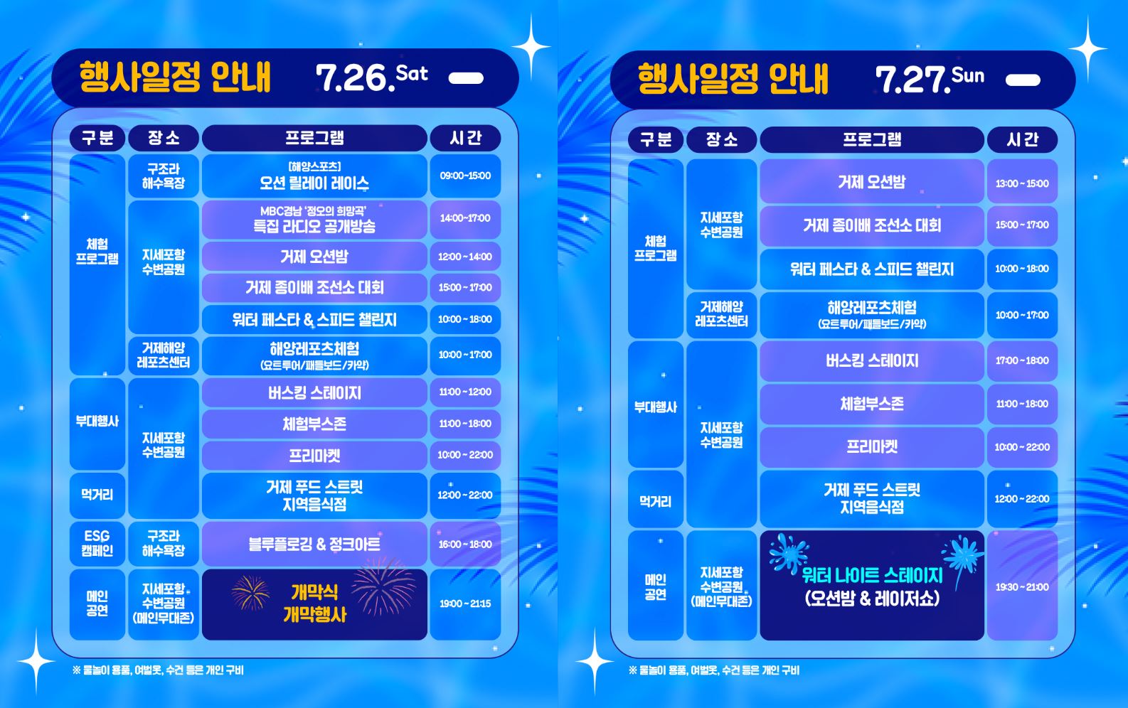 - 워터 나이트 스테이지 (오션밤&레이져쇼) : 27(일) 19:30 ~ 21:00