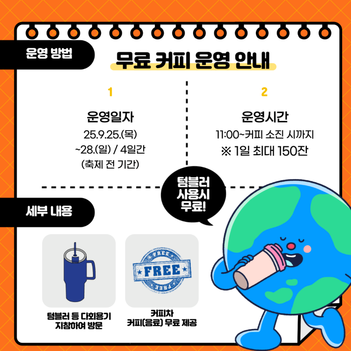 - 친환경 축제 캠페인 : 텀블러 지참 시 무료 커피 (일 150잔 한정)