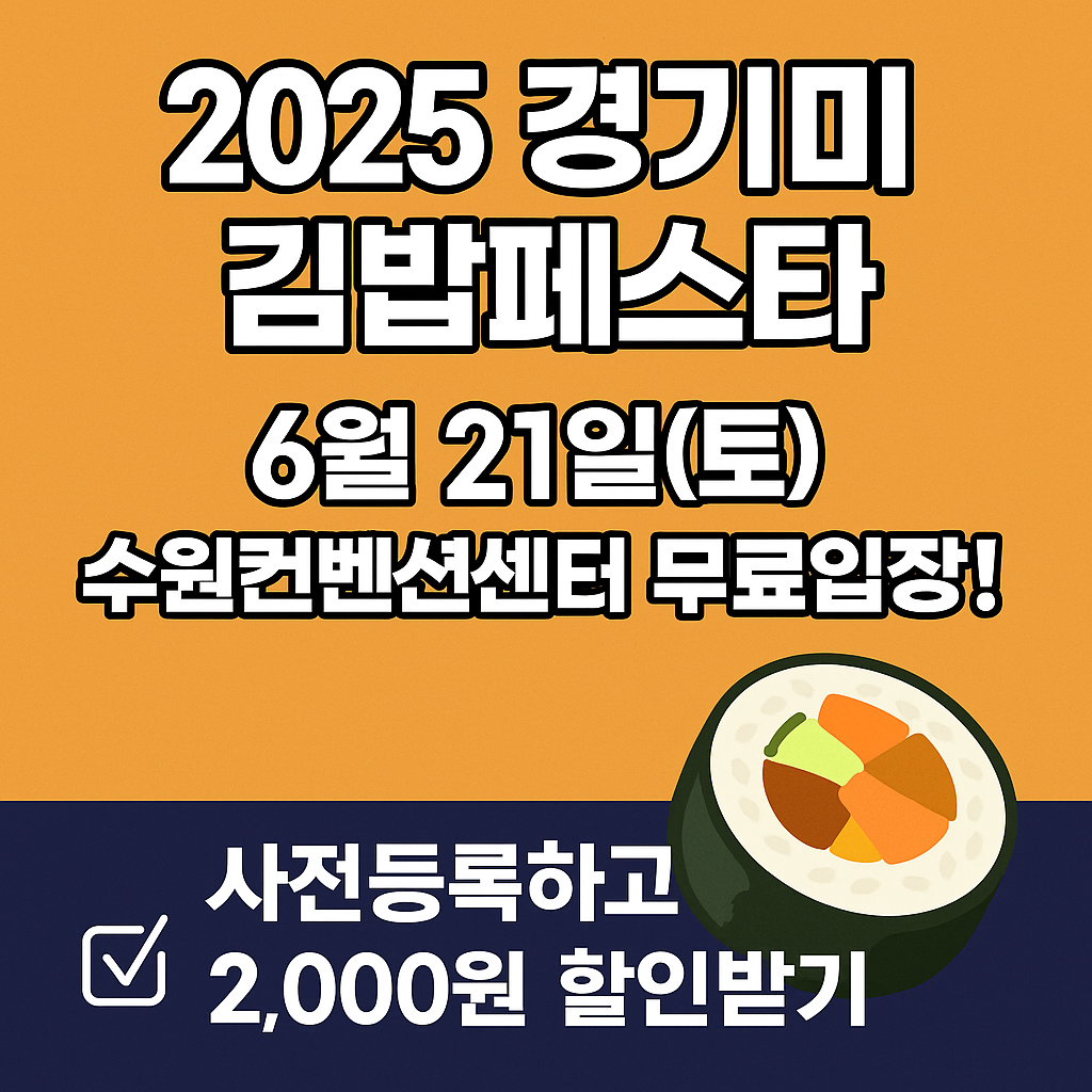 2025년 6월 21일(토), 수원컨벤션센터 제2전시장에서 개최되는 '2025 경기미 김밥페스타'는 경기미로 만든 김밥을 주제로 한 박람회로, 다양한 프로그램과 체험을 통해 가족 단위 관람객들에게 즐거운 시간을 제공합니다.
