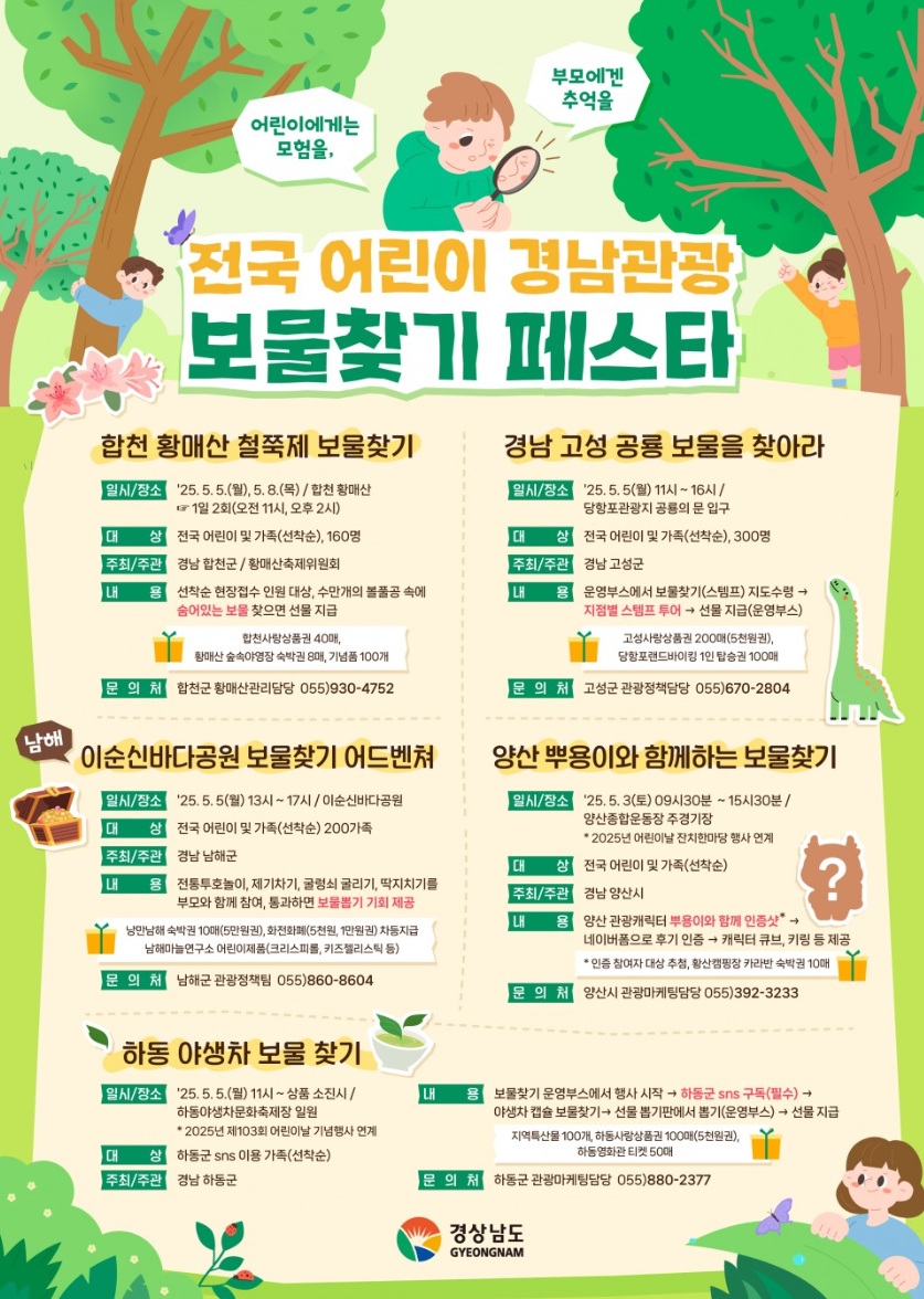 경남 관광 보물찾기 페스타는 경상남도 전역의 매력적인 관광지를 소개하고, 매년 어린이날을 기념하여 가족들이 함께 보물을 찾는 형식으로 경남의 숨은 명소를 탐방하며 다양한 혜택을 받을 수 있는 참여형 테마의 축제입니다. 이 행사는 5월 3일부터 진행되며, 합천군, 하동군, 고성군, 남해군, 양산시 등 경남의 주요 관광지에서 열립니다. 이 행사는 어린이들에게는 새로운 경험을, 부모님들에게는 즐거운 추억을 선사하는 기회를 제공합니다. 단순한 관광이 아닌, 가족 단위의 참여를 통해 서로의 유대감을 더욱 깊게 할 수 있는 시간이 될 것입니다.