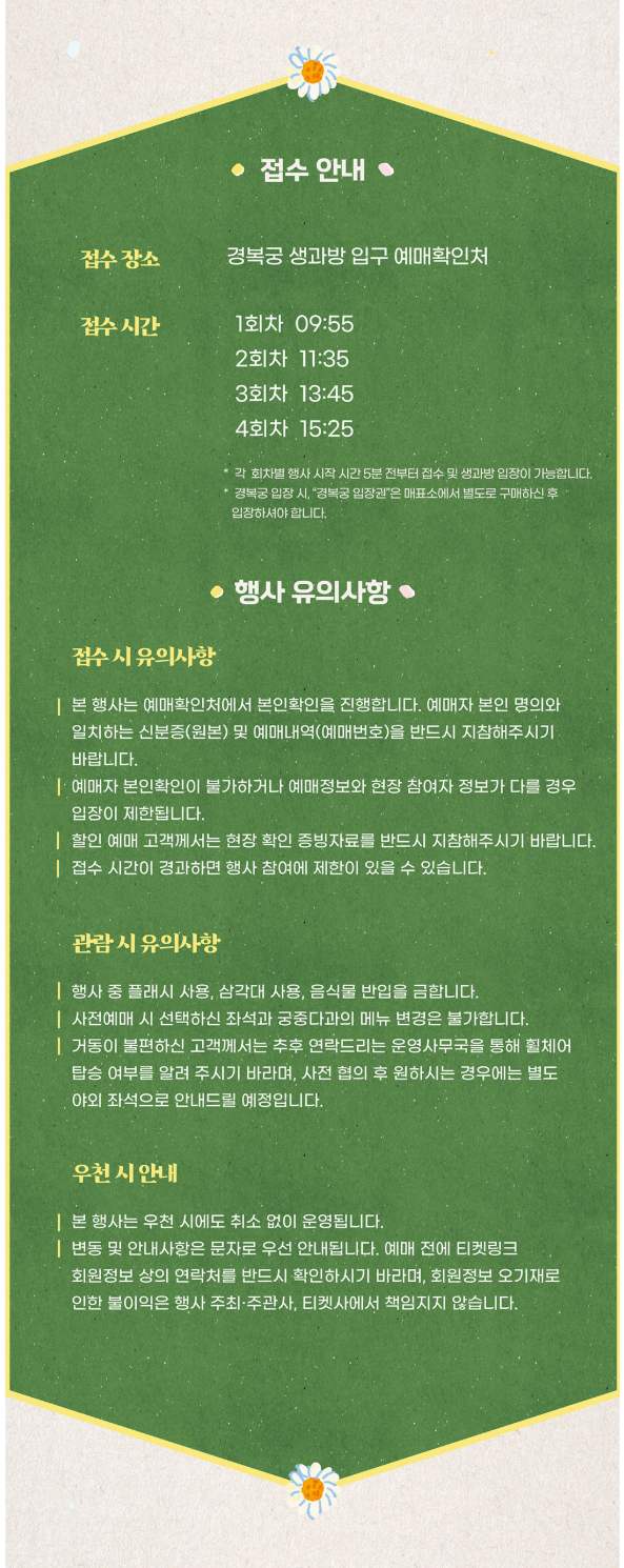 경복궁 생과방 체험은 추첨제로 진행되며, 사전 예약이 필수입니다. 예약은 정식 예매처인 티켓링크를 통해 진행되며, 100% 사전 예약 판매 원칙을 따릅니다.