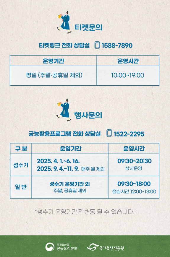 더 많은 정보는 국가유산진흥원 공식 웹사이트나 티켓링크를 통해 확인할 수 있습니다. 궁금한 점이 있으시면 전화 상담을 통해 문의하실 수 있습니다. 운영 시간은 평일 오전 9시부터 오후 6시까지입니다.