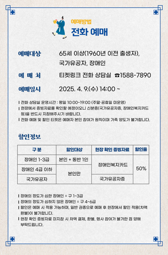 - 예매대상 : 65세 이상(1960년 이전 출생자), 국가유공자, 장애인
