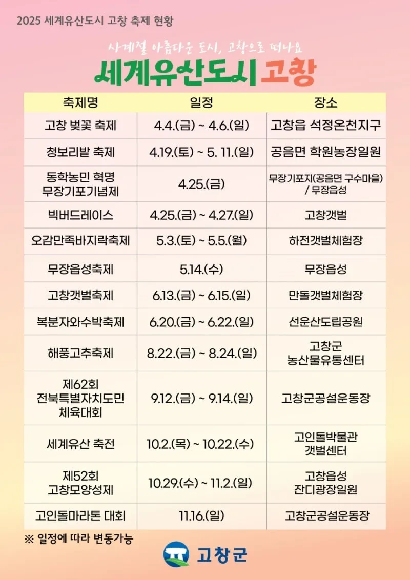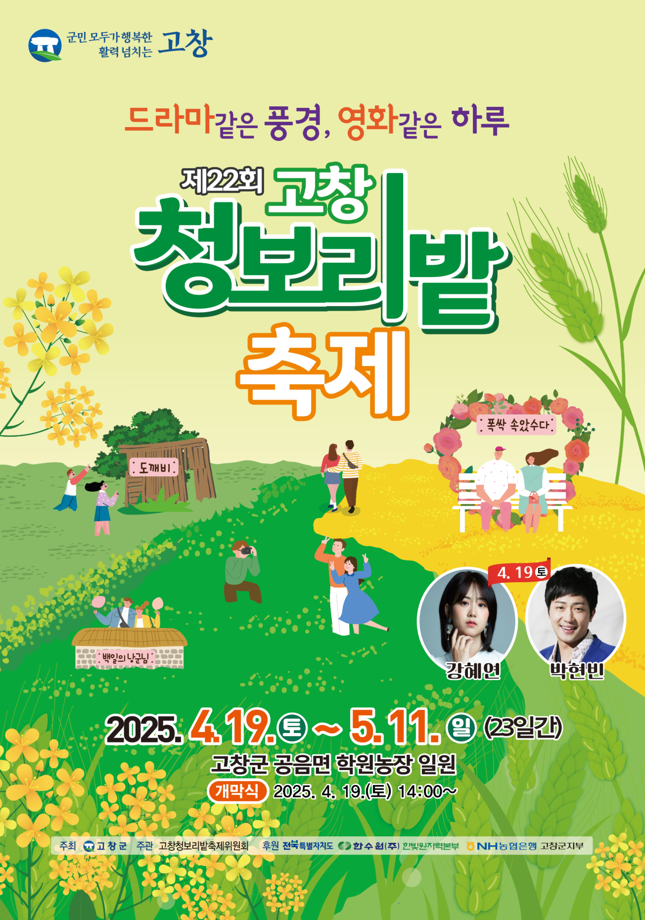 2025년도 고창청보리밭 축제는 4월 19일부터 5월 11일까지 진행됩니다. 총 23일간 이어지는 이 축제는 다양한 행사와 이벤트로 가득 차 있습니다. 축제 일정은 다음과 같습니다: