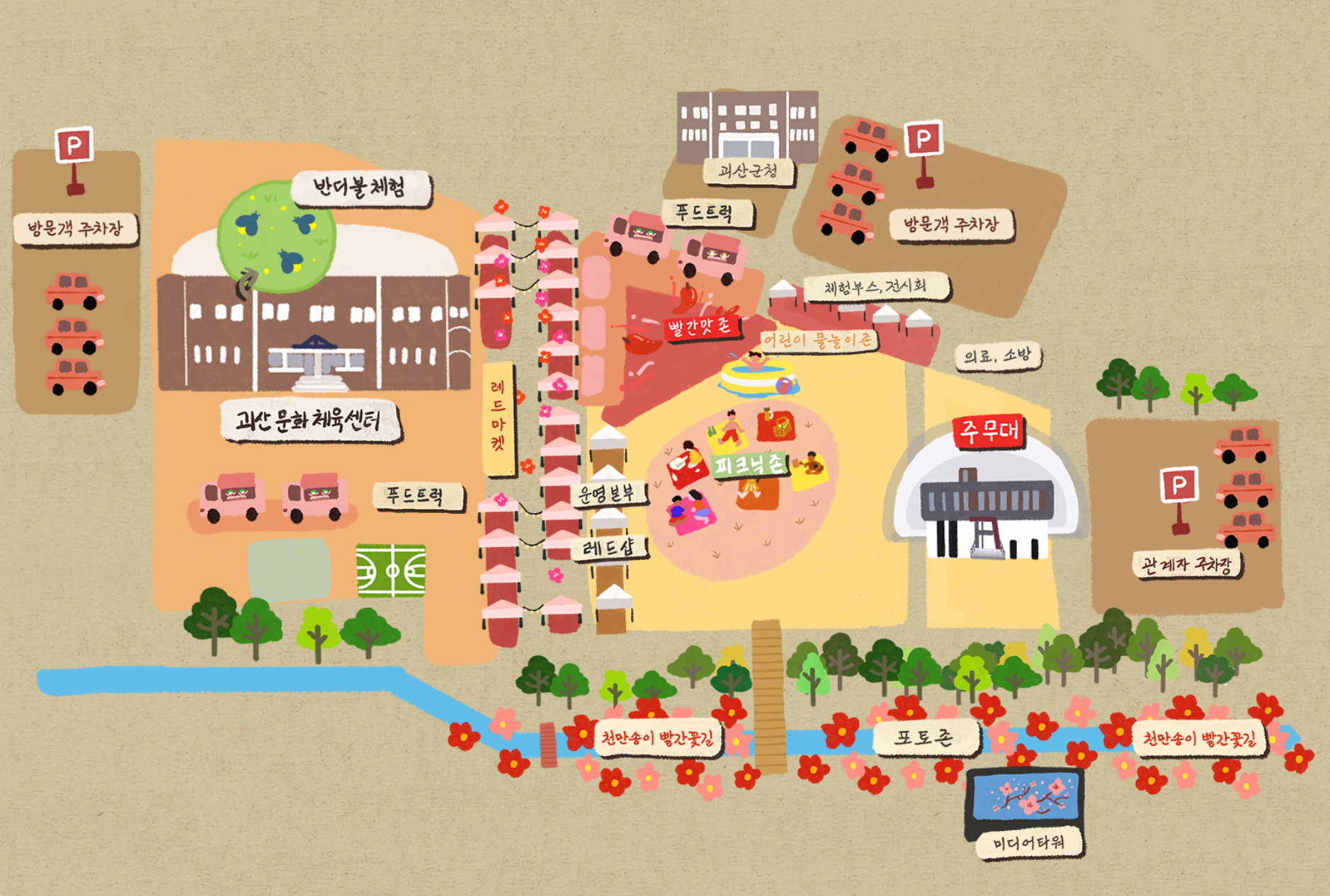 - 빨간꽃 산책길 : 봄철에 어울리는 빨간 봄꽃 산책로 및 다양한 포토스팟 조성