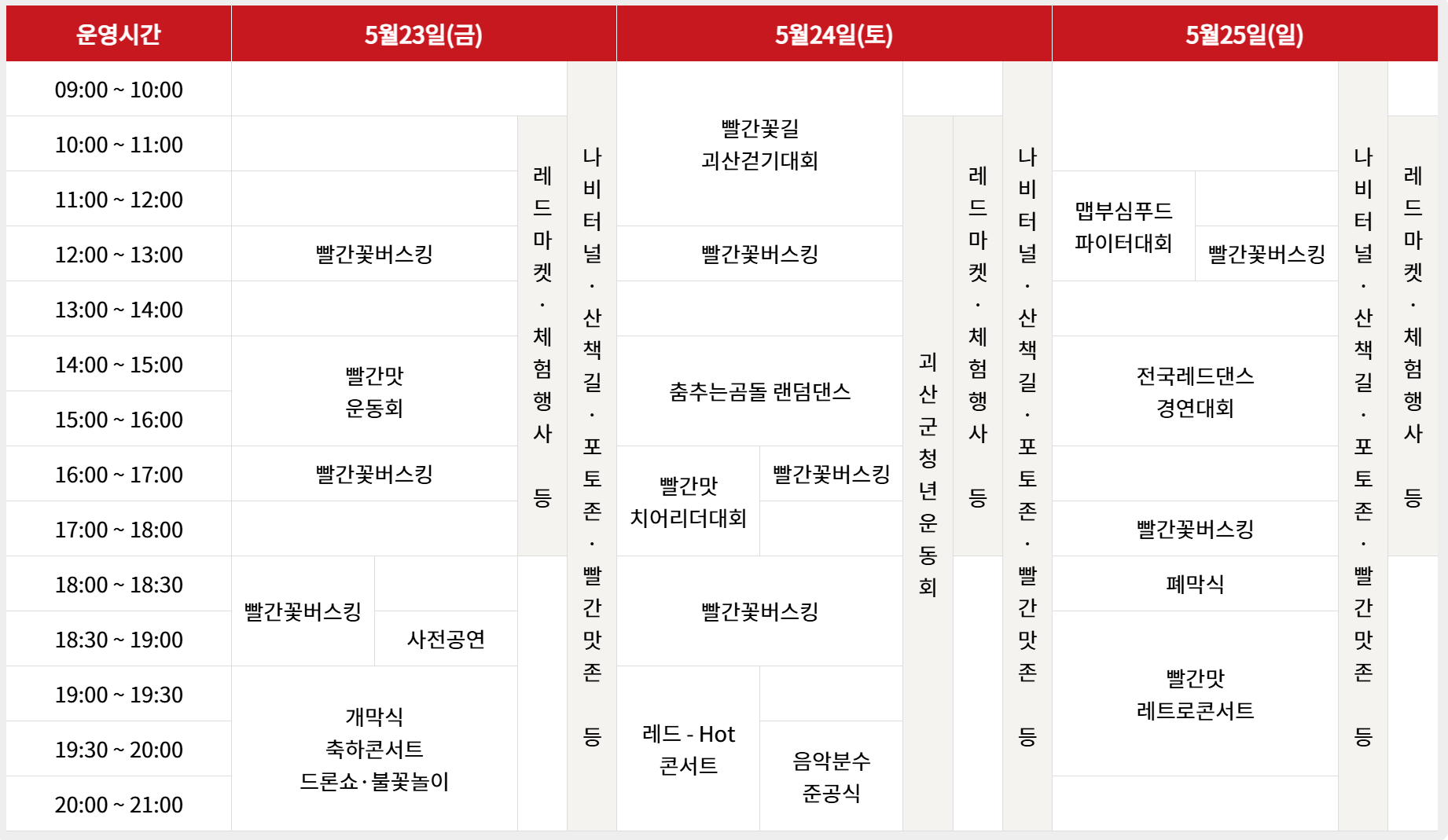 - 빨간맛 운동회 : 각 읍면별 대표선수들이 참여하는 지역민 공동체 단합행사 * 읍면별 협동 단체게임 및 레크레이션 등 진행 2025.5.23(금) 14:00 / 괴산유기농엑스포광장 잔디광장