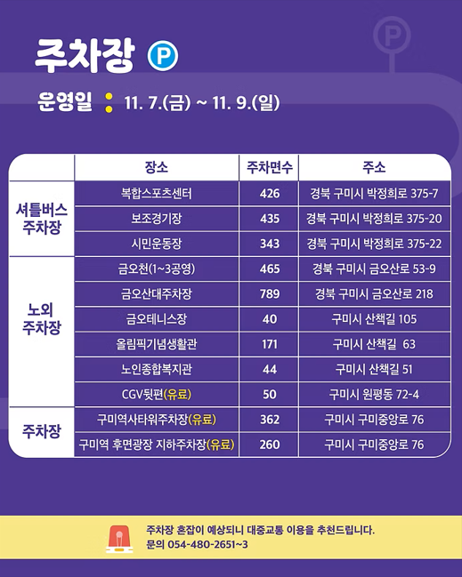 | 주차 | 복합스포츠센터, 구미역지하 |