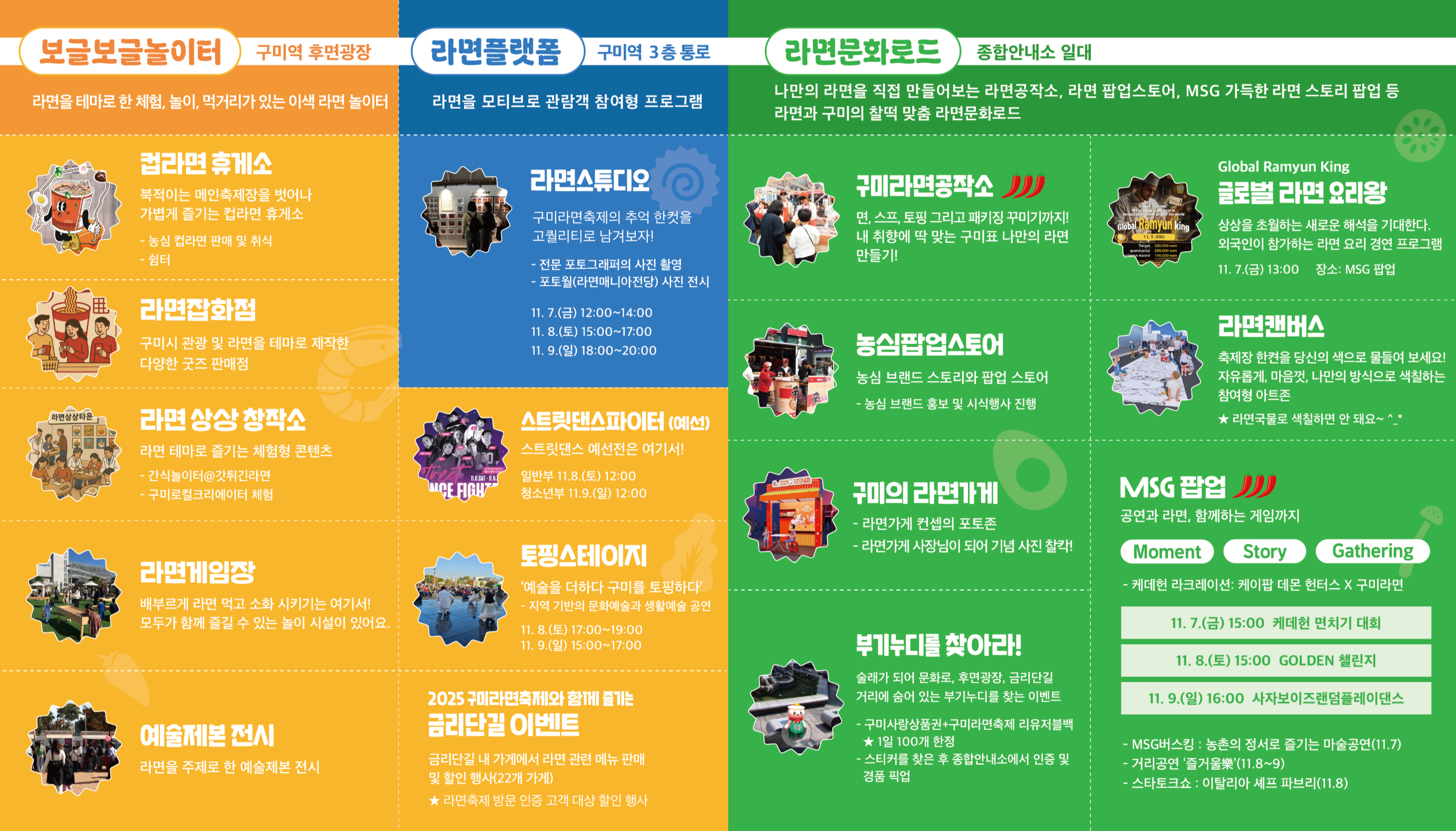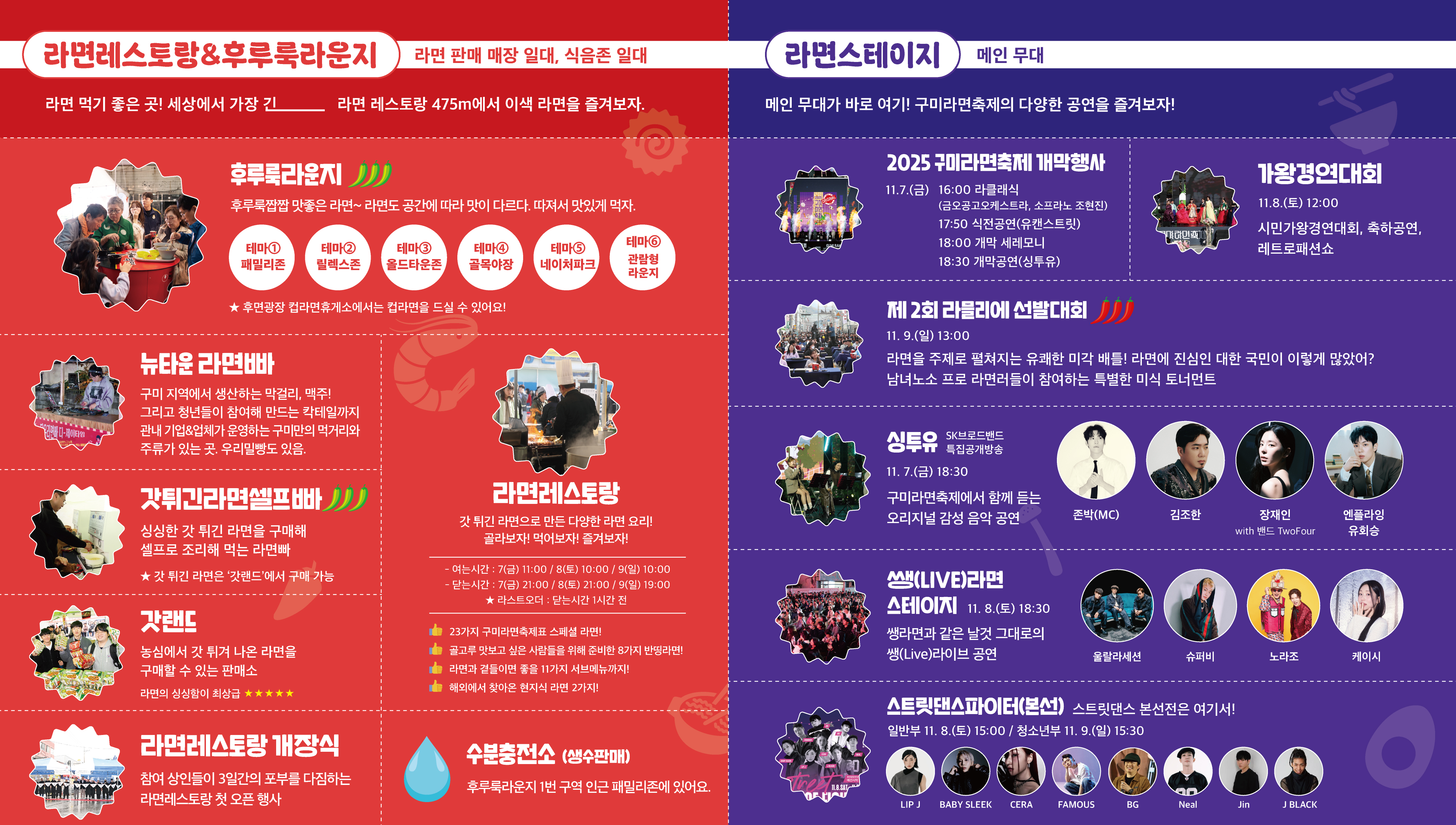 | 🎤 주요 행사 | 라면요리왕, 라면셀프바, 라면캠버스, MSG 팝업, 스트릿댄스파이터, 가왕경연대회 |