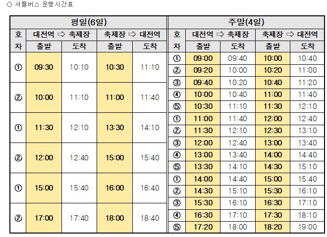 - 셔틀버스 운행 : 대전역 ↔ 축제장 구간 (평일 1시간 간격, 주말 30분 간격)