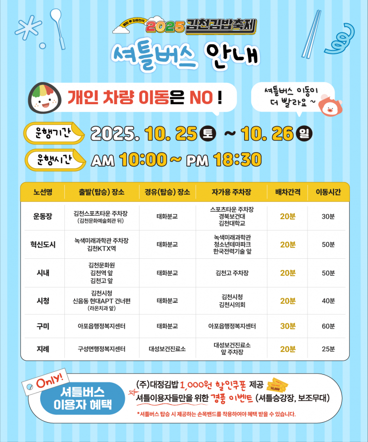 - 이용혜택 : 셔틀버스 이용객에게 (주)대경김밥 1,000원 할인쿠폰 및 경품 이벤트 참여권 제공