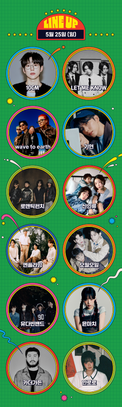 - 5월 25일 : 10cm, let me know, wave to earth, 기현, 로맨틱펀치, 신인류, 엔플라잉, 오월오일, 유다빈밴드, 윤마치, 카더가든, 한로로