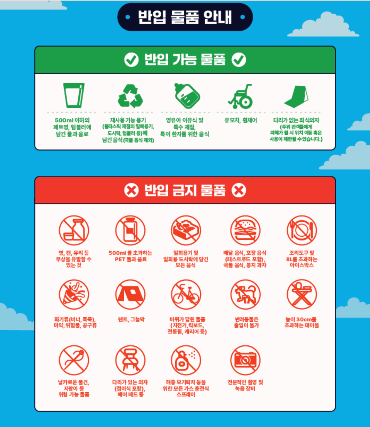 - 반입 금지 물품 : 병, 캔, 유리 등 부상 유발 물품, 500ml 초과하는 페트병 물과 음료, 일회용기 및 일회용기에 담긴 모든 음식, 배달음식, 포장음식, 조리도구 및 8l 초과 아이스박스, 화기류, 마약, 공구류, 텐트, 그늘막, 바퀴가 달린 물품, 반려동물 불가, 높이 30cm 초과 테이블, 날카로운 물건, 다리가 있는 의자, 에어 베드, 가스 충전식 스프레이, 전문적인 촬영 및 녹음 장비.