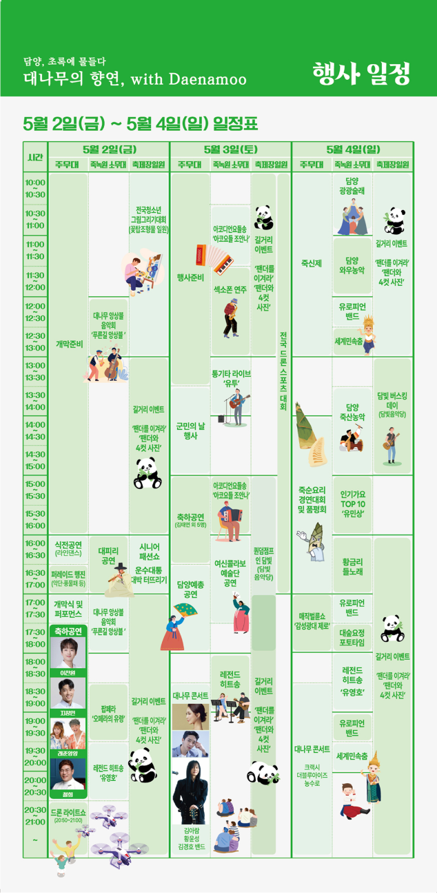 - 5월2일(금) ~ 5월6일(화) 죽녹원 봉황루 앞 : 대나무피리 등 버스킹 운영, 황금리 들노래, 담양광광술래,와우농악, 죽산농악