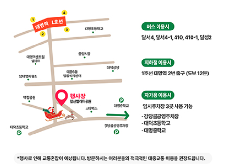 A코스 : 대명역3번 출구→ kt남대구지사 건너 → 대명6동행정복지센터 → 행사장