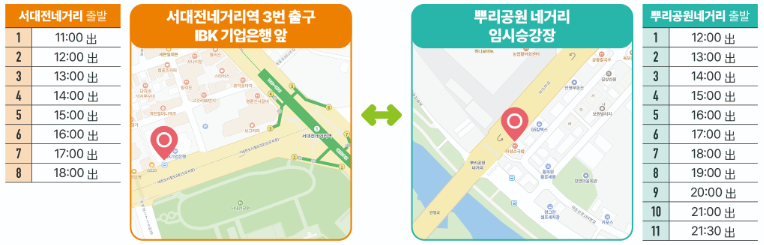 - 셔틀버스 : 서대전네거리역 3번 출구 버스승강장 ↔ 뿌리공원네거리 임시승강장 (11:00~21:30, 1시간 간격)