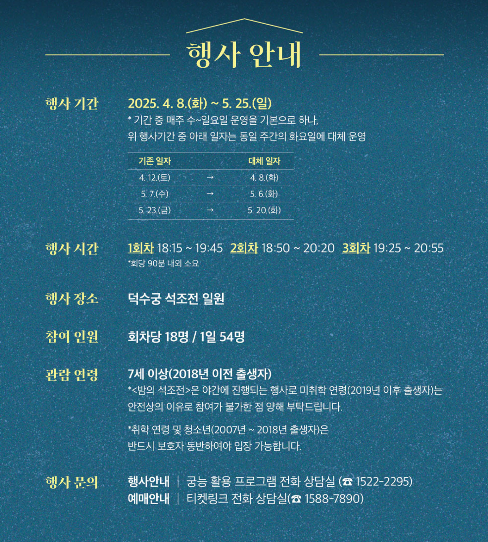 *<덕수궁 밤의 석조전>은 야간에 진행되는 행사로 미취학 연령(2019년 이후 출생자)는 안전상의 이유로 참여가 불가한 점 양해 부탁드립니다.