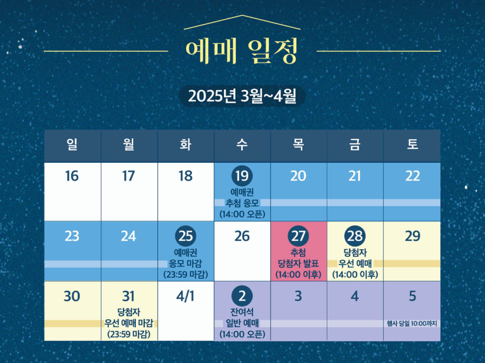 - 예매권 추첨 응모 : 온라인 신청 후 결제 완료 → 응모 확정! 2025. 3. 19.(수) 14:00 ~ 3. 25.(화) 23:59 / 7일간