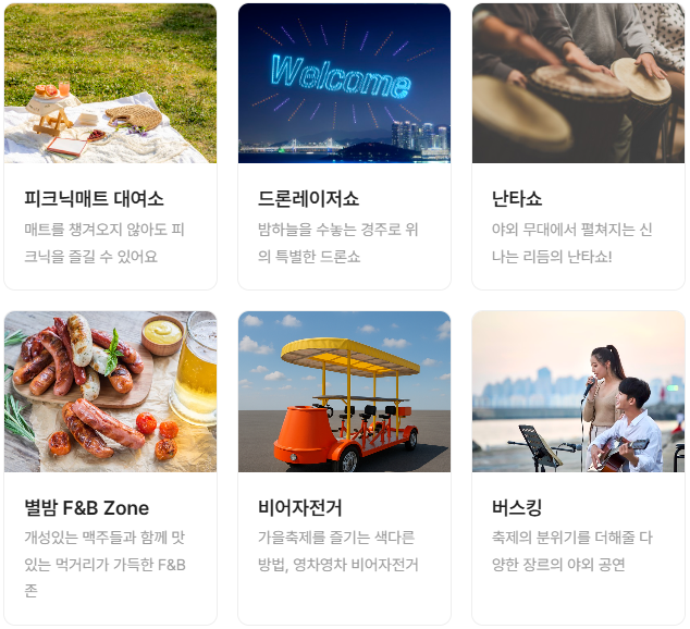 - 관람대/시상대: 드론레이저쇼(7,13일), 난타 공연(7일)