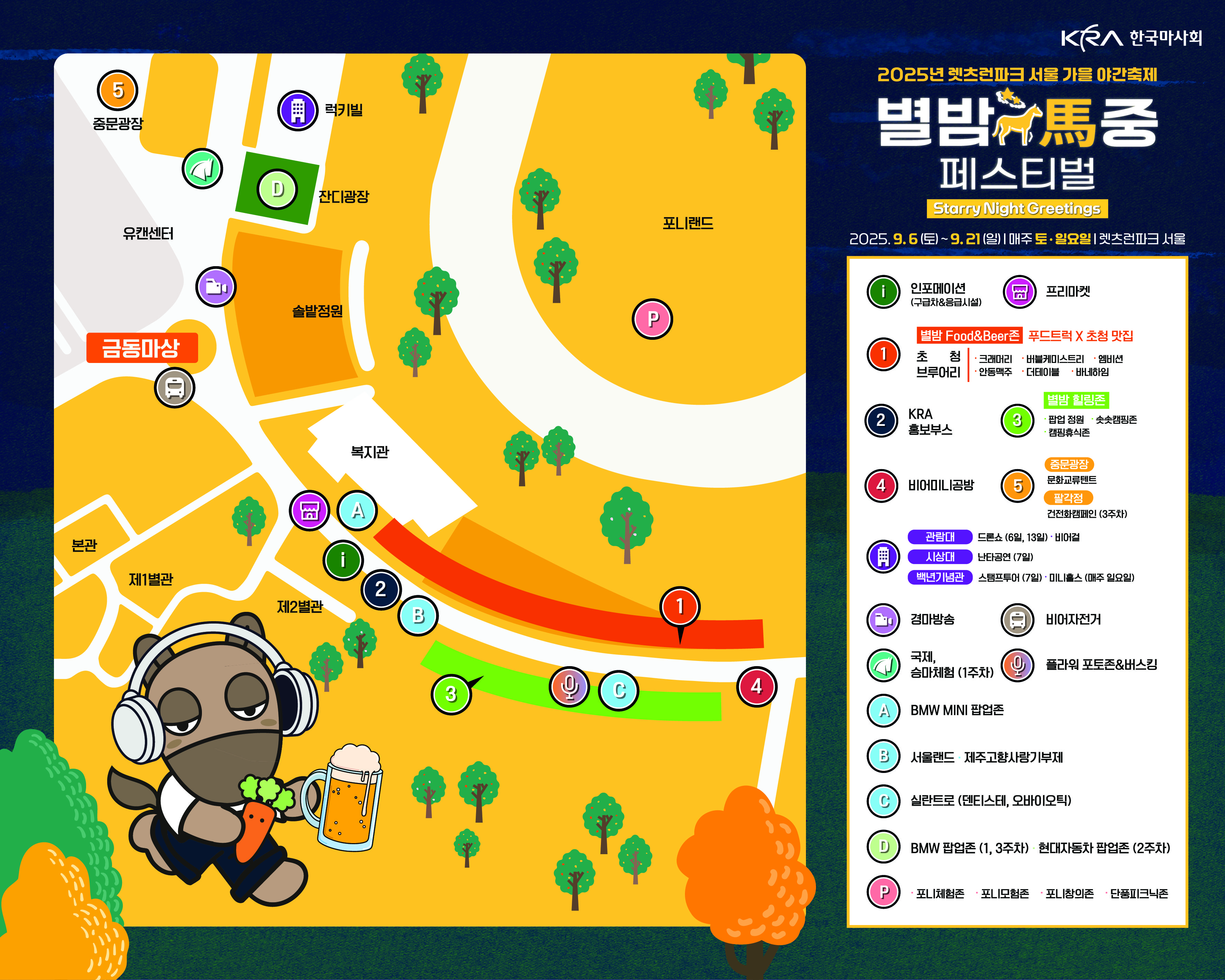 - 황금마상/중문광장: 비어자전거 퍼레이드, 경마관람 LED 스크린, 서울랜드 팝업존, 비어걸, BMW 전시부스