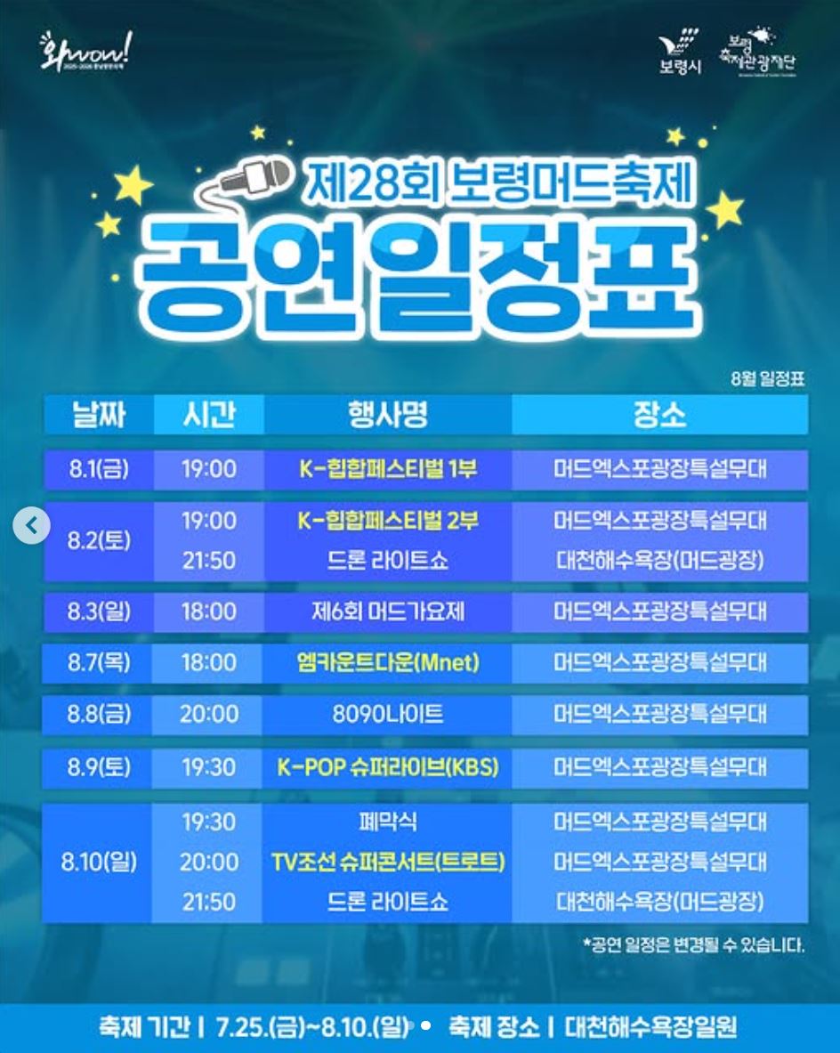 - 장소: 충남 보령시 대천해수욕장 일원 ( 보령머드엑스포광장 포함)