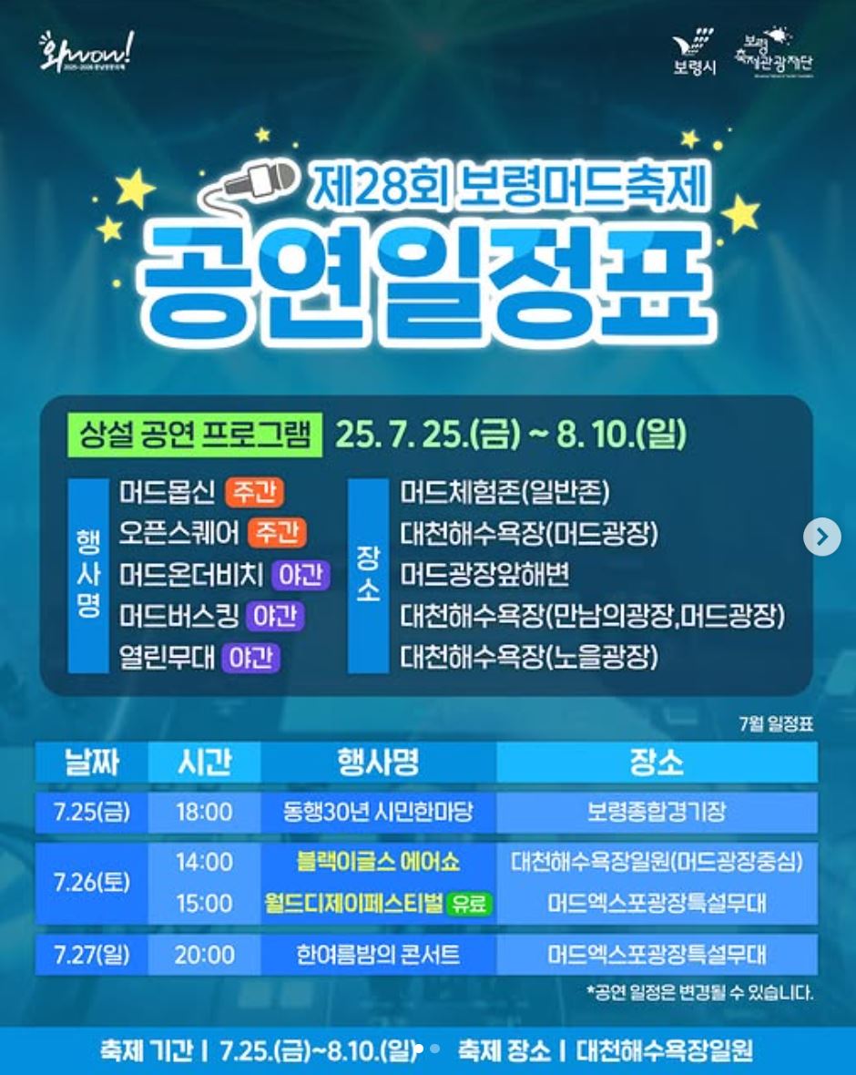 2025년 7월 25일부터 8월 10일까지 대천해수욕장에서 개최되는 제28회 보령머드축제는 매년 수백만 명의 관광객이 찾는 대한민국 대표 여름 축제입니다.