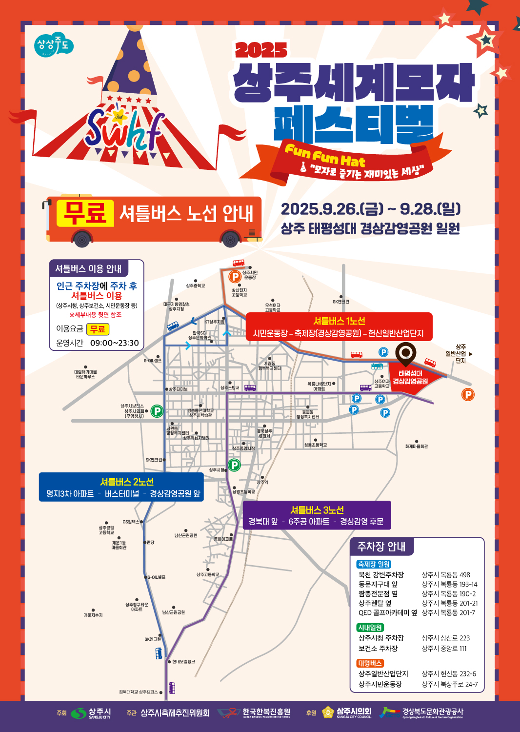 🎩 2025 상주세계모자페스티벌이 돌아왔습니다! 2025.9.26(금) ~ 9.28(일), 3일간 경북 상주시 태평성대 경상감영공원 일원에서 열리는 가을 대표 지역축제로, 올해 주제는 “Fun Fun Hat, 모자로 즐기는 재미있는 세상”입니다.