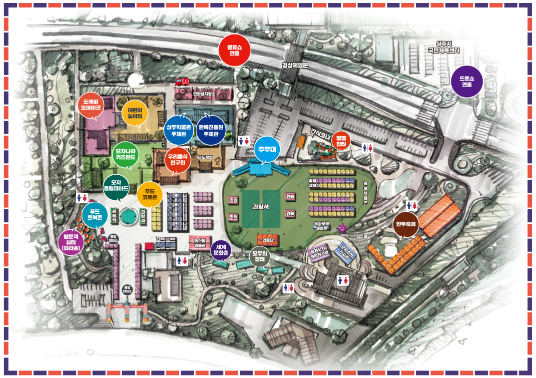 | 공연·경연 | 상주세계모자페스티벌, 상주전국사진 촬영대회, 모자댄스 경연, 올해의 모자, 상주예술무대, 시민 어울마당, 3색 콘서트 등 | 야간 메인무대 + 불꽃·드론쇼 |