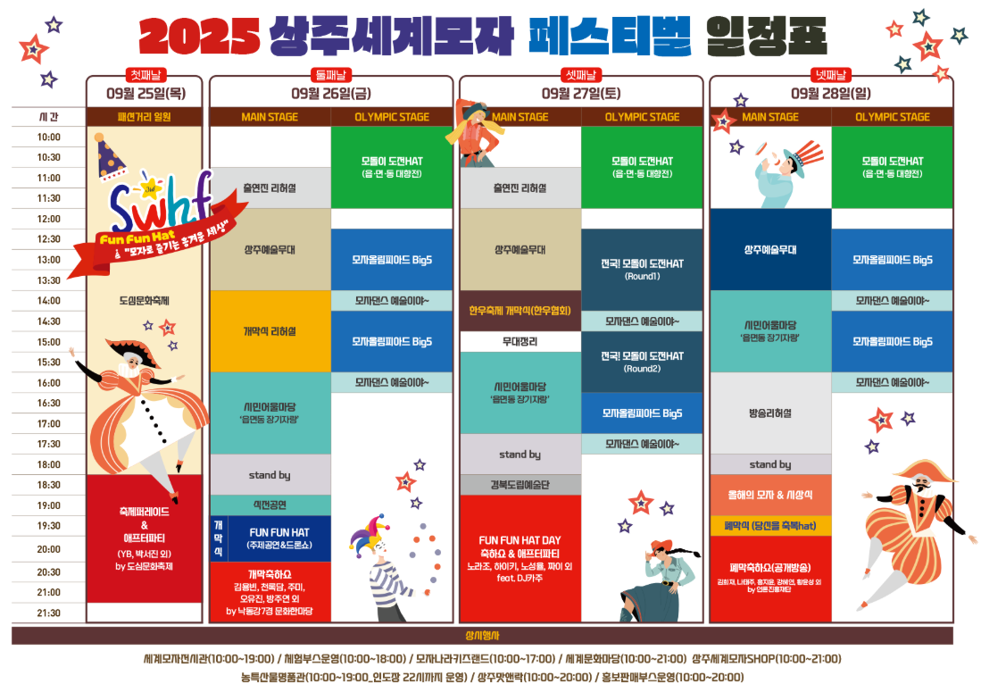 | 하이라이트 | 축제 퍼레이드 & 애프터파티, 세계모자전시관, 모덴이 도전 Hat(올림픽/전국), 상주예술무대, 시민 어울마당, 불꽃·드론쇼 |