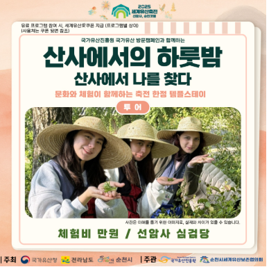 - 내용 : 일반인, 외국인 등 테마별 운영 / 천년 고찰 선암사 체험, 스님과의 차담, 새벽 편백나무 숲 탐방 등