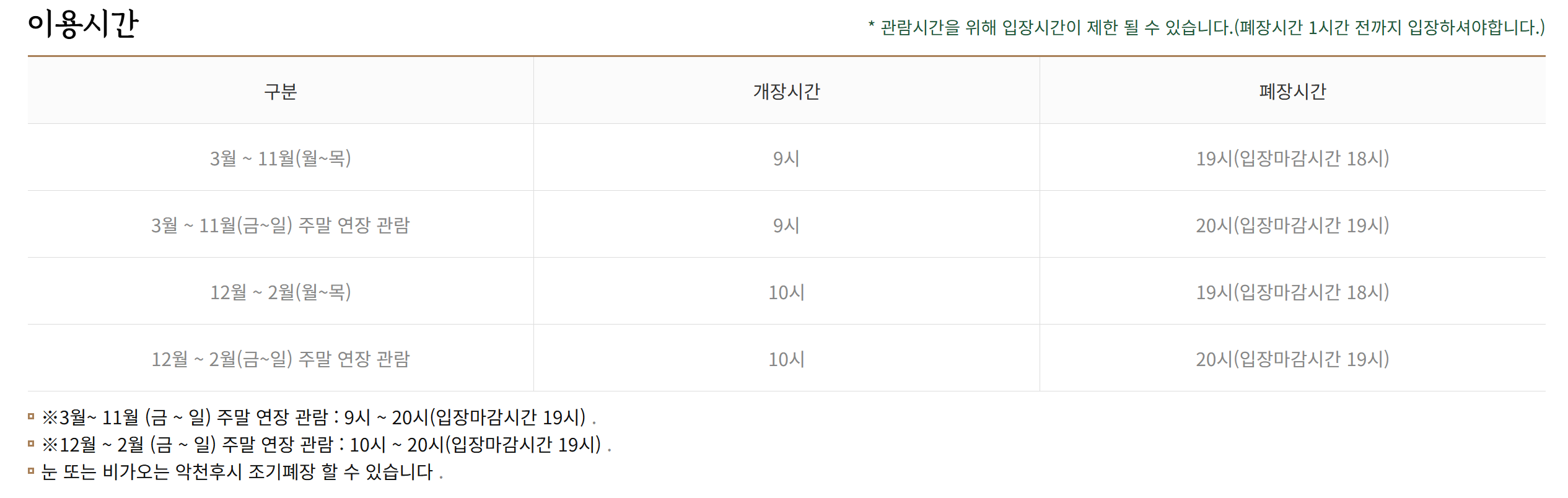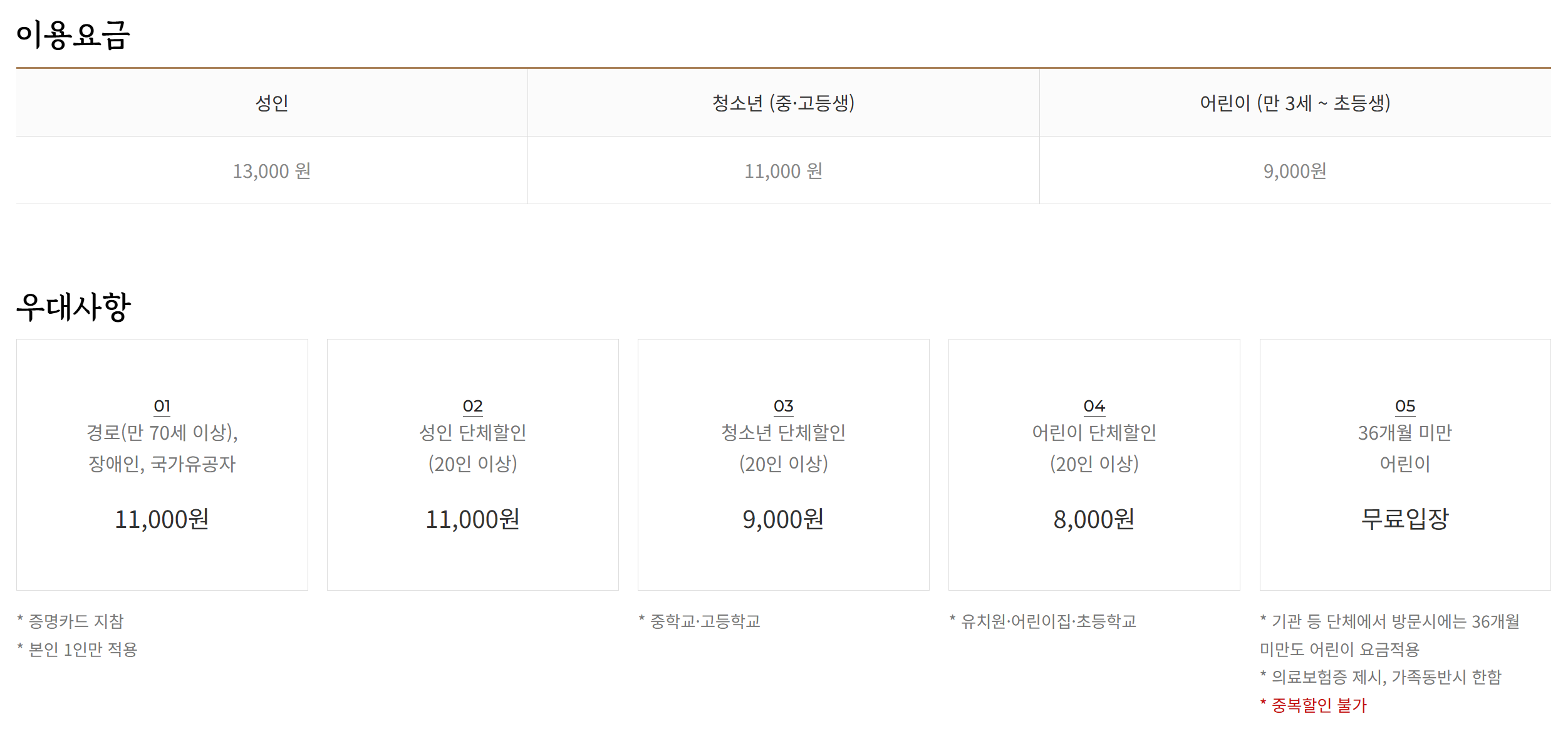 - 입장료 : 성인 13,000원, 청소년 11,000원 어린이 9,000원 경로, 장애인, 국가유공자: 11,000원