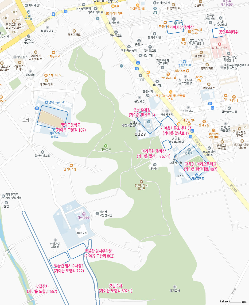 행사기간 상설·임시주차장 다수 운영(함안군청, 가야읍사무소, 아라초/중 등).