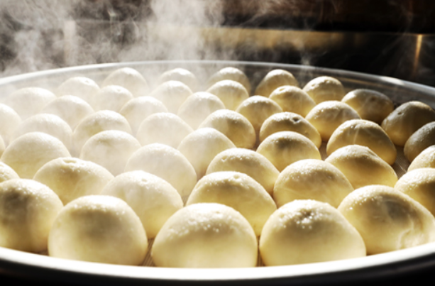 - 윤기 촉촉한 찐빵 위에 뽀얀 찜기 김