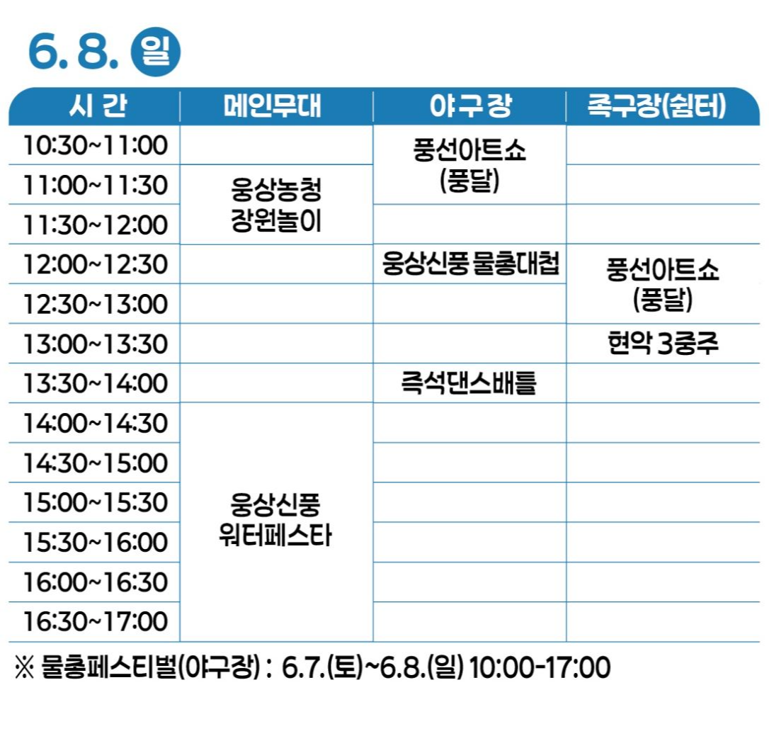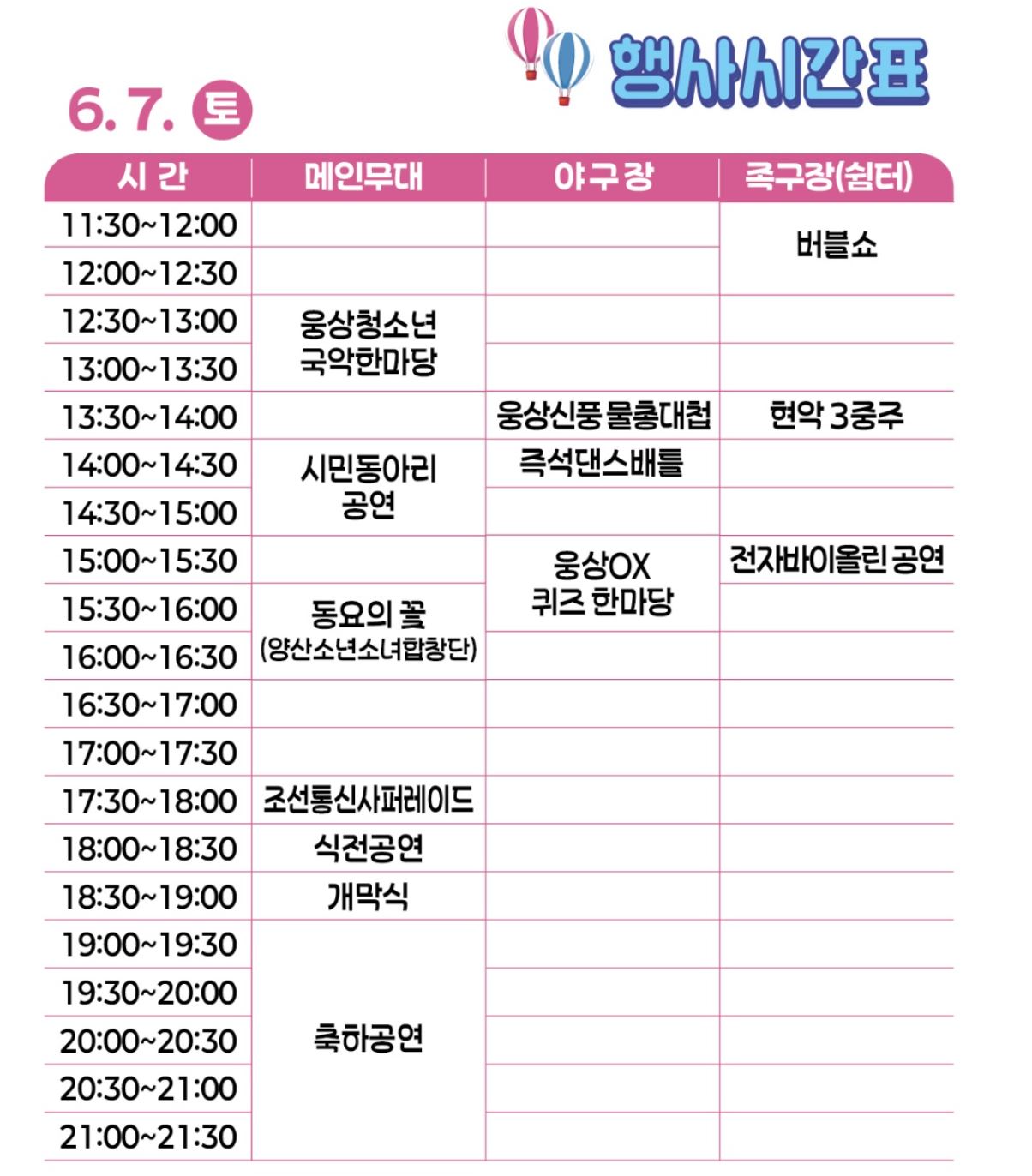 | 웅상청소년 국악한마당 | 6.7 12:30~13:30 | 특설무대(축구장) |
