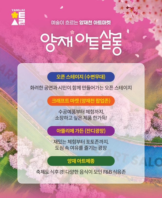 양재 아트살롱은 서울 서초구 양재천에서 열리는 문화 행사로, 예술가와 관람객이 소통할 수 있는 장을 마련합니다. 이 행사는 지역 주민뿐만 아니라 많은 관광객들에게도 큰 인기를 끌고 있습니다. 예술 작품 전시, 플리마켓, 다양한 체험 프로그램 등이 마련되어 있어 가족 단위 방문객들에게도 적합한 행사입니다. 🌸