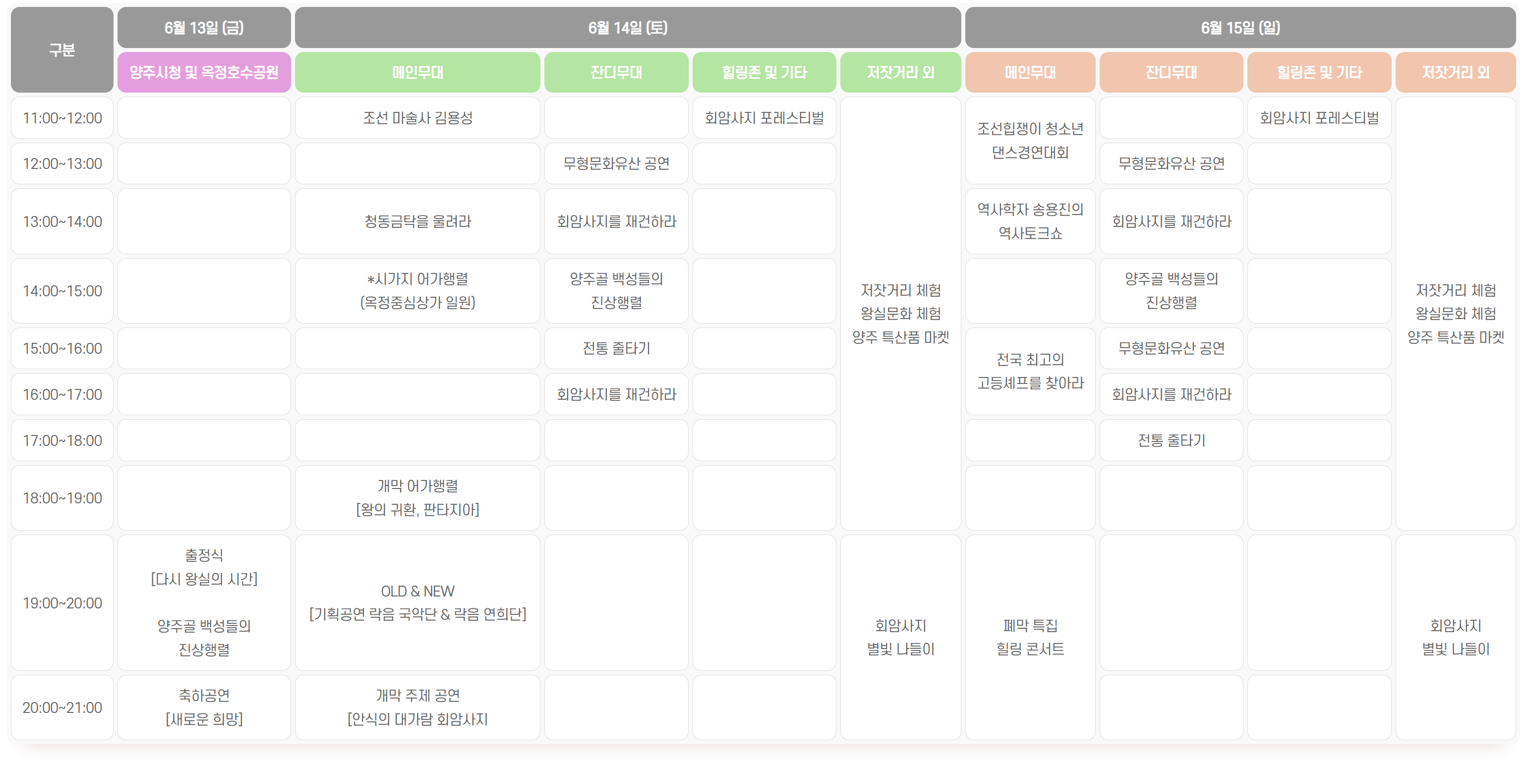 - 양주골 백성들의 진상행렬 : 6.14(토) 14:00~15:00, 6.15(일) 14:00~15:00 보조무대