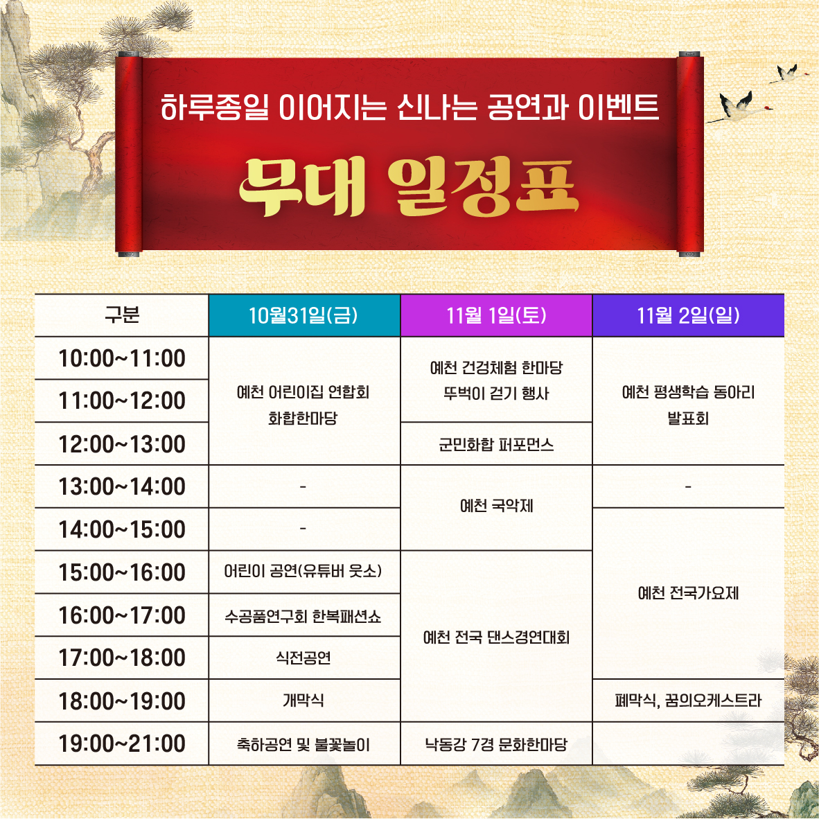 | 🎭 무대공연 & 한마당 이벤트 | 10.31~11.2 | 유튜버 공연, 패션쇼, 군민화합 퍼포먼스 등 |