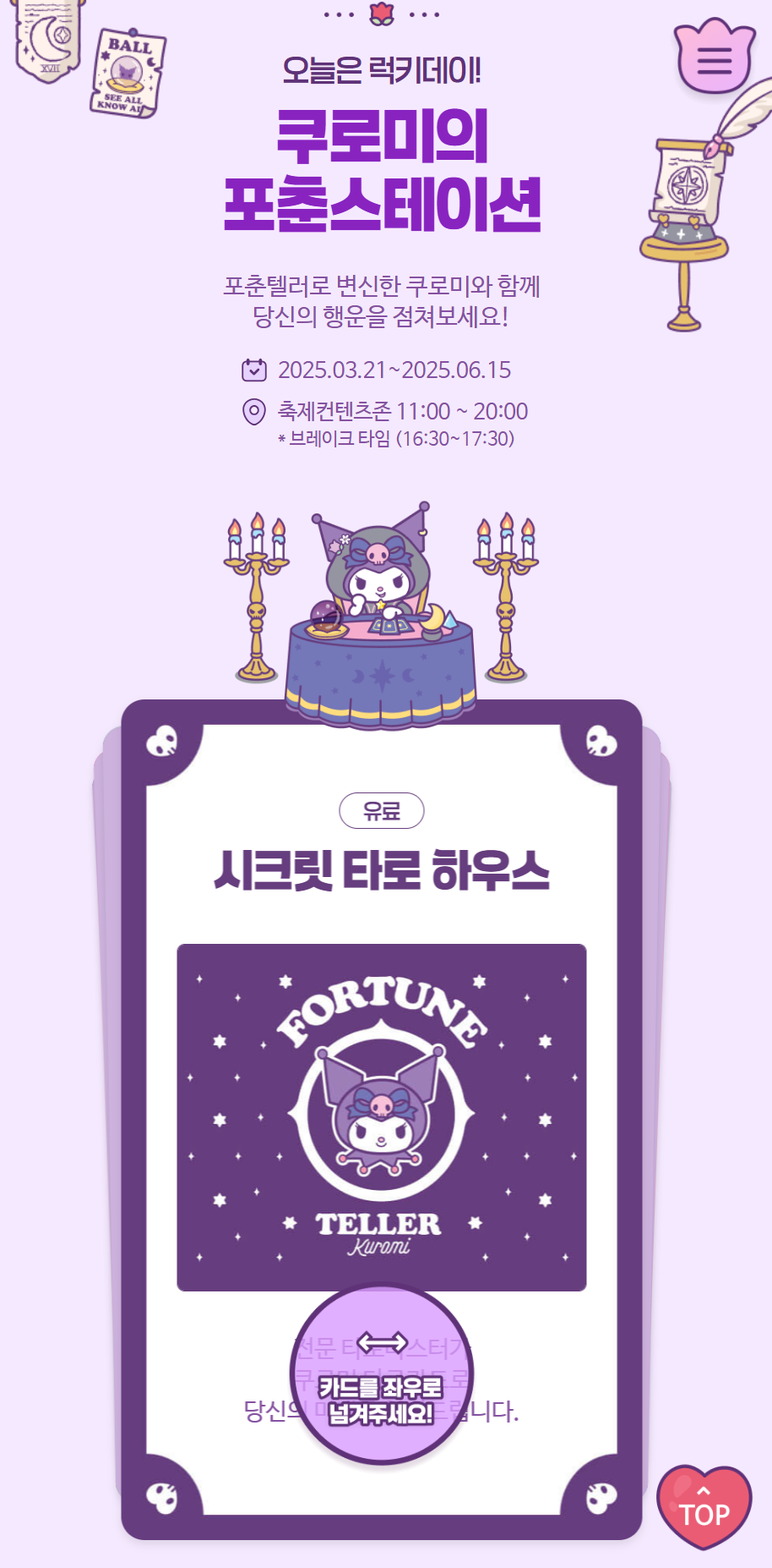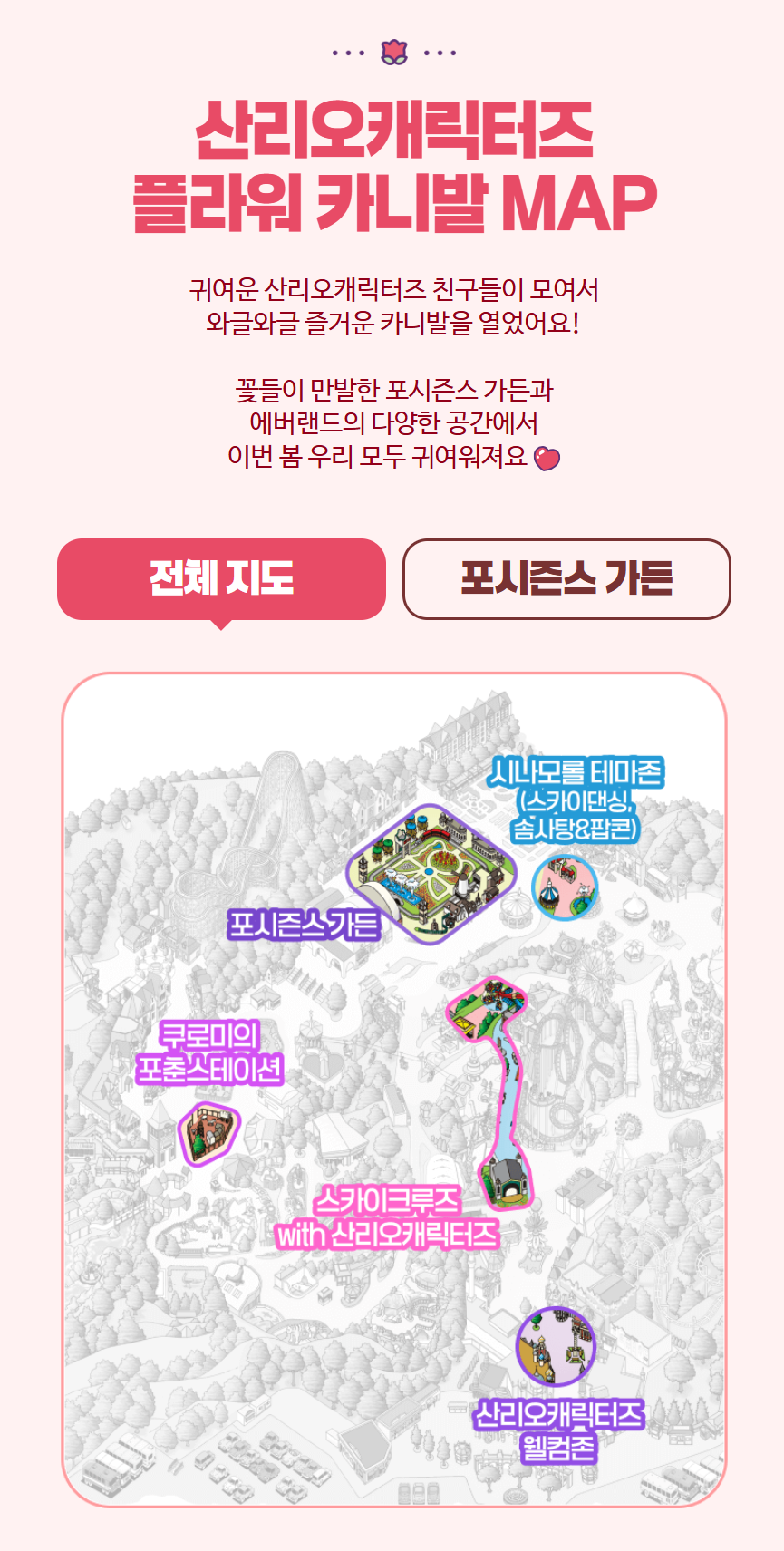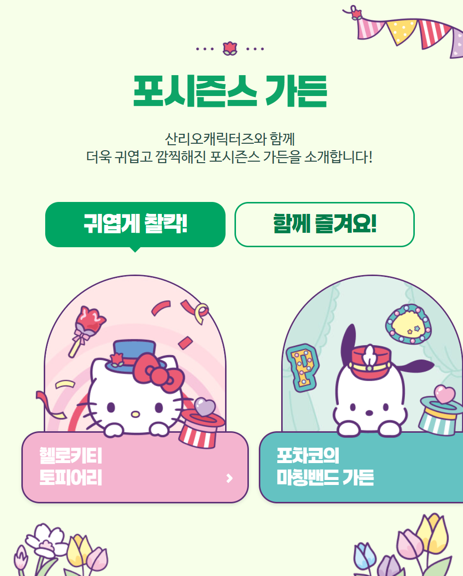올해의 튤립축제는 특히 산리오 캐릭터즈와의 콜라보로 더욱 특별합니다. 포시즌스 가든에서는 산리오 캐릭터들의 스토리를 귀엽고 재미있게 체험할 수 있는 11곳의 포토존이 마련되어 있습니다. 이곳에서는 인기 캐릭터들과 함께 사진을 찍고, 다양한 이벤트에 참여할 수 있는 기회가 주어집니다.