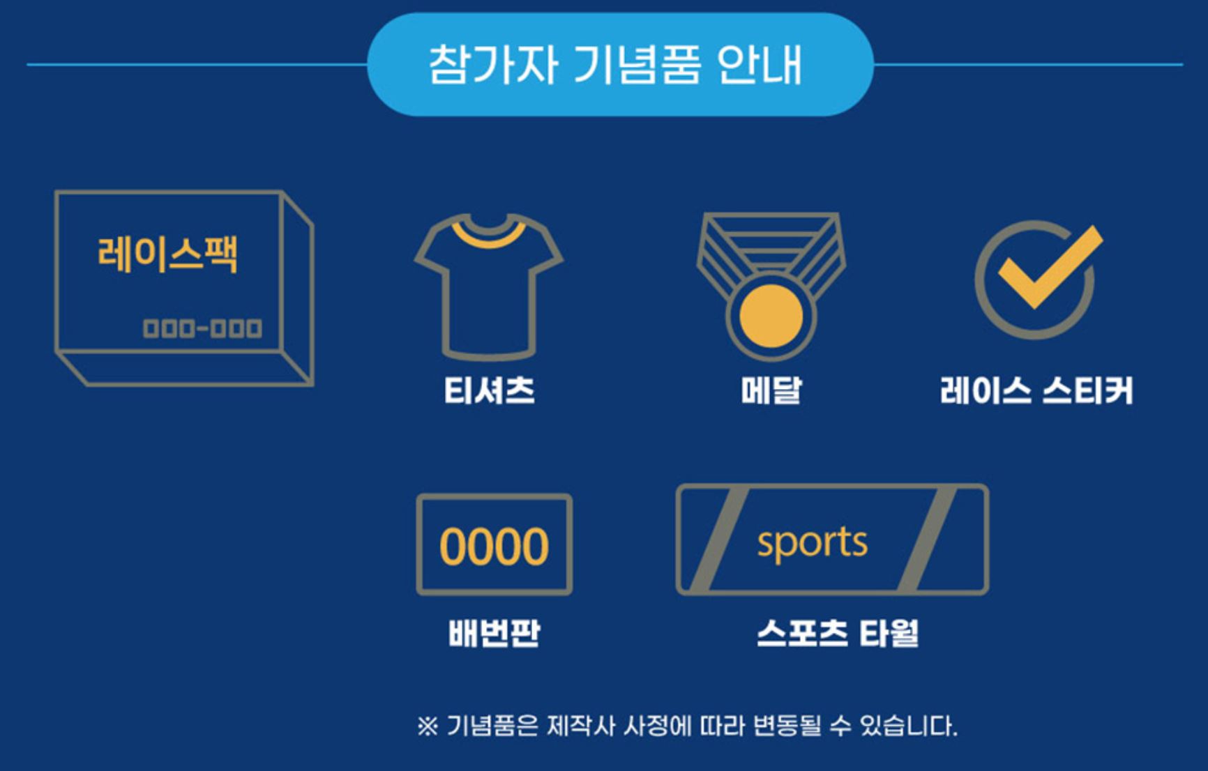 - 참가자 전용 굿즈 구성: 티셔츠, 배번호, 스포츠타월, 메달 등