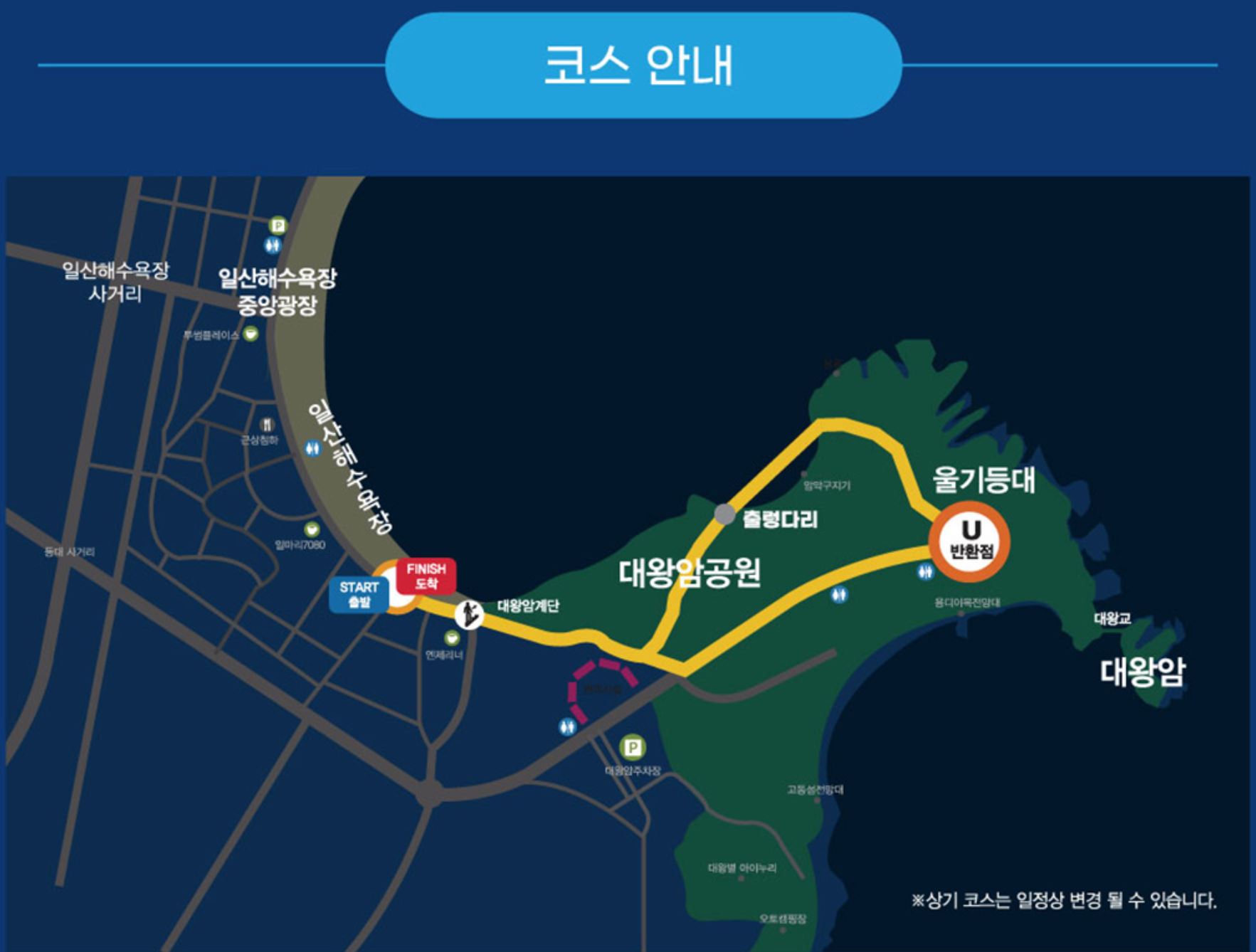 - 코스: 일산 해수욕장 특설무대 출발→해변도로 → 별빛광장 → 대왕암공원 출렁다리 → 울기등대(반환) → 대왕암공원(3km)